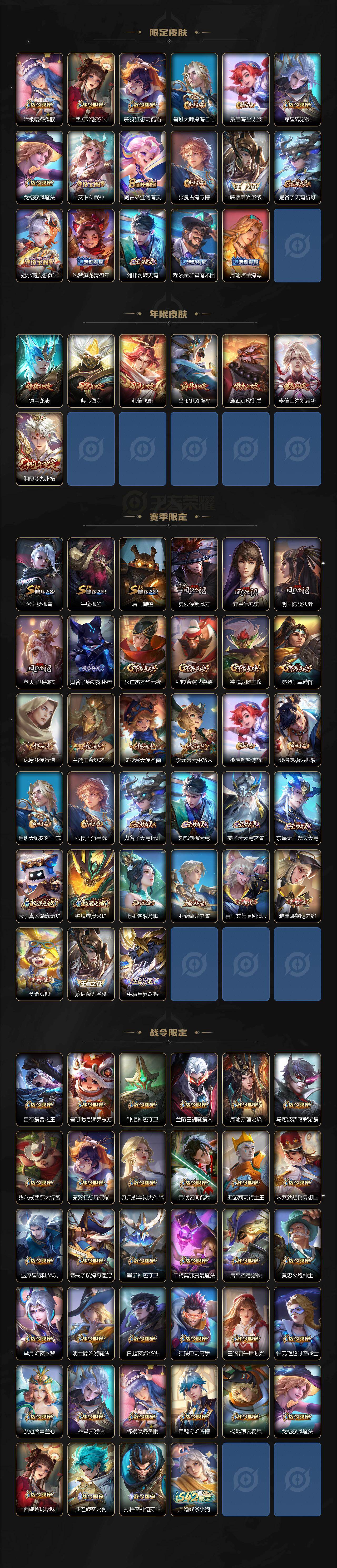 【限定皮肤】:姜子牙天穹之誓,狄仁杰阴阳师,廉颇寅虎御盾,赵云皇家上将,赵云引擎之心,墨子神迹守卫,嬴政优雅恋人,孙