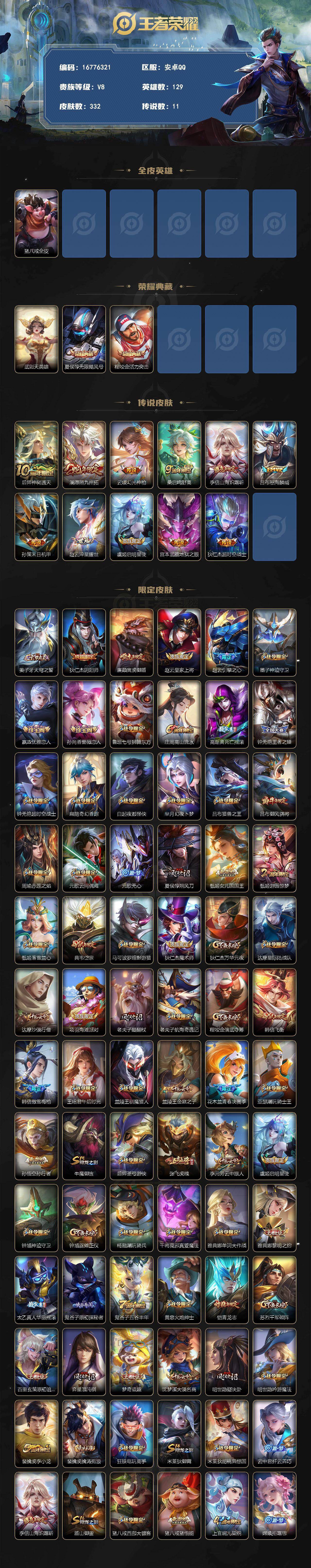 【16776321】安卓Q-V8-永恒钻石III段位-129英雄-332皮肤-2典藏皮肤-1典藏英雄-11传说-99史诗