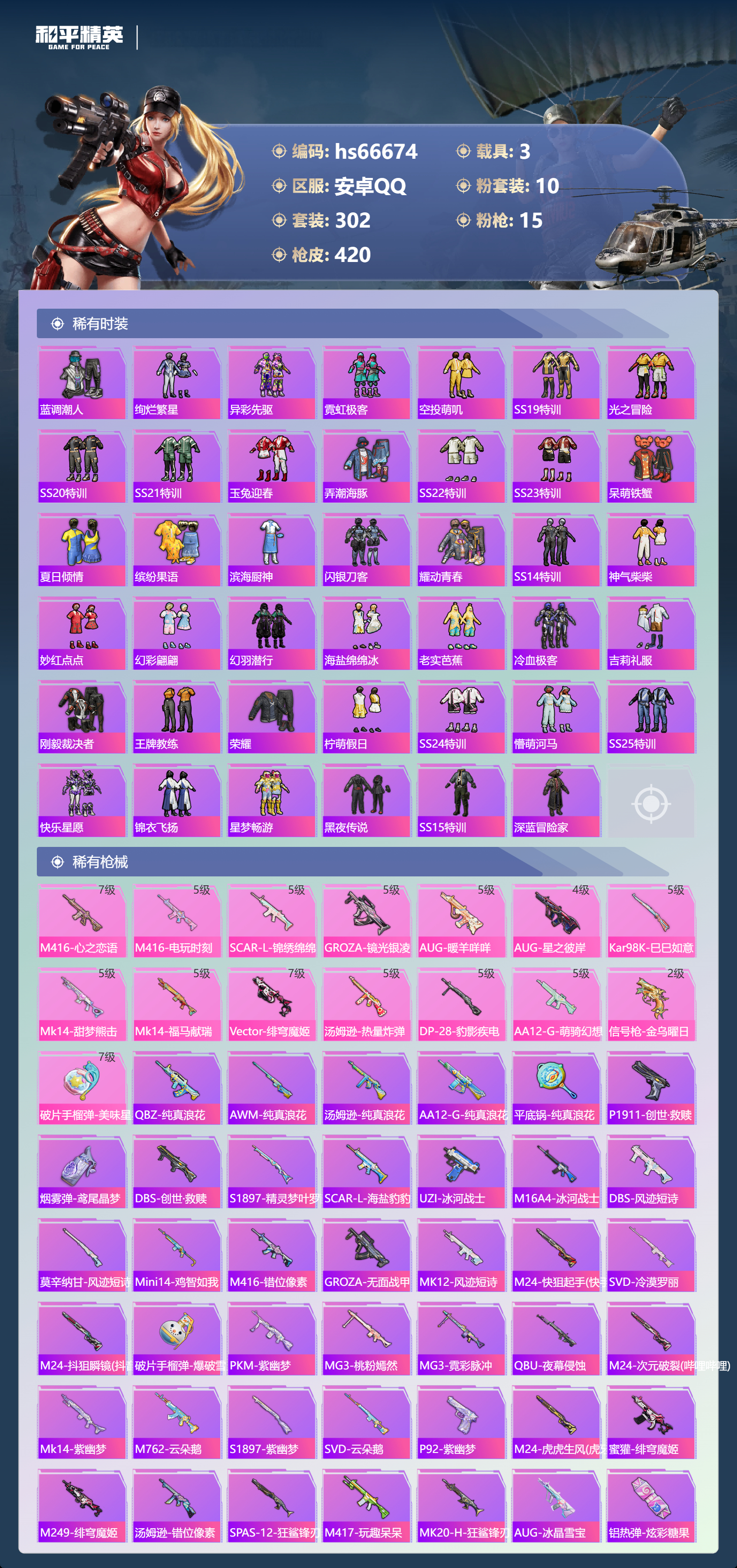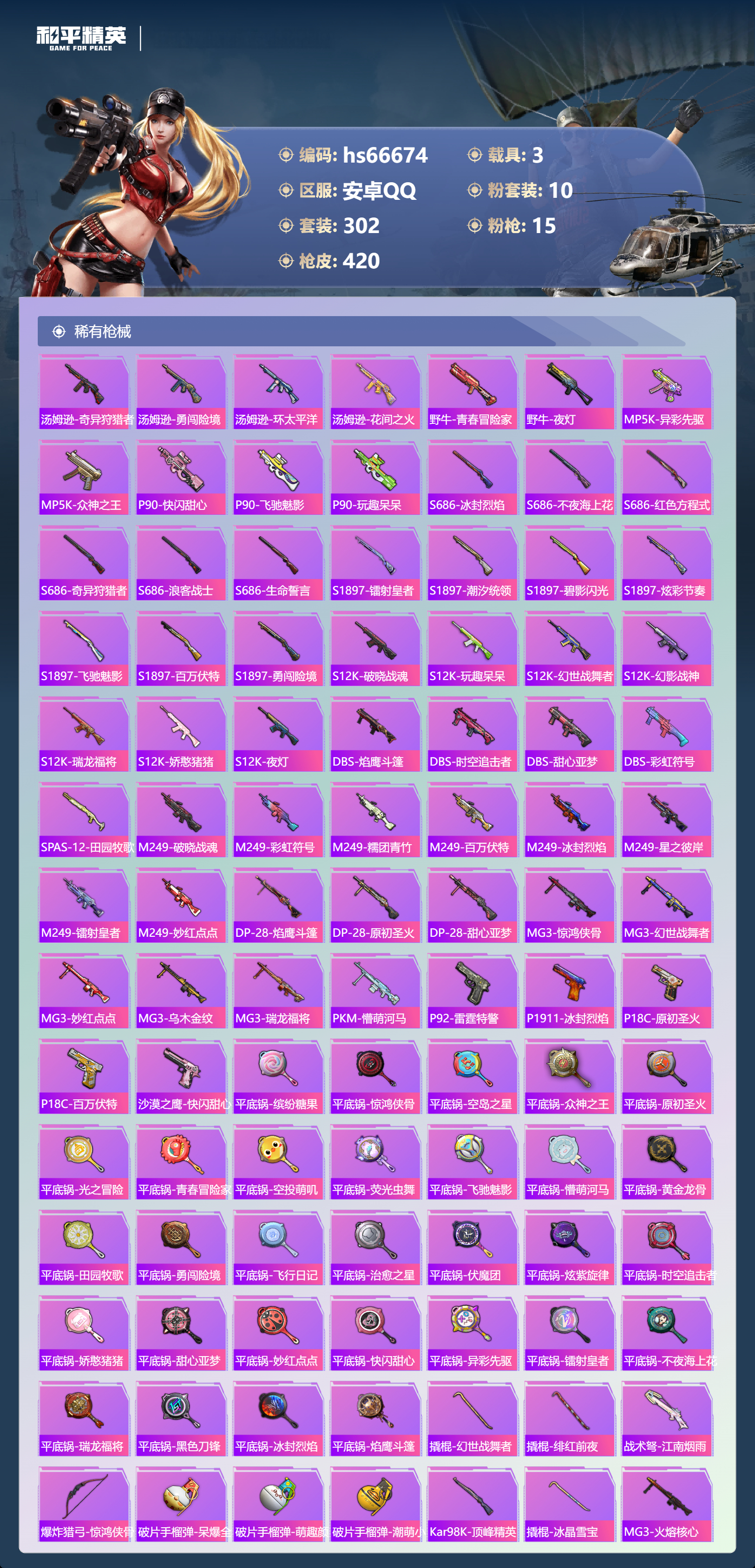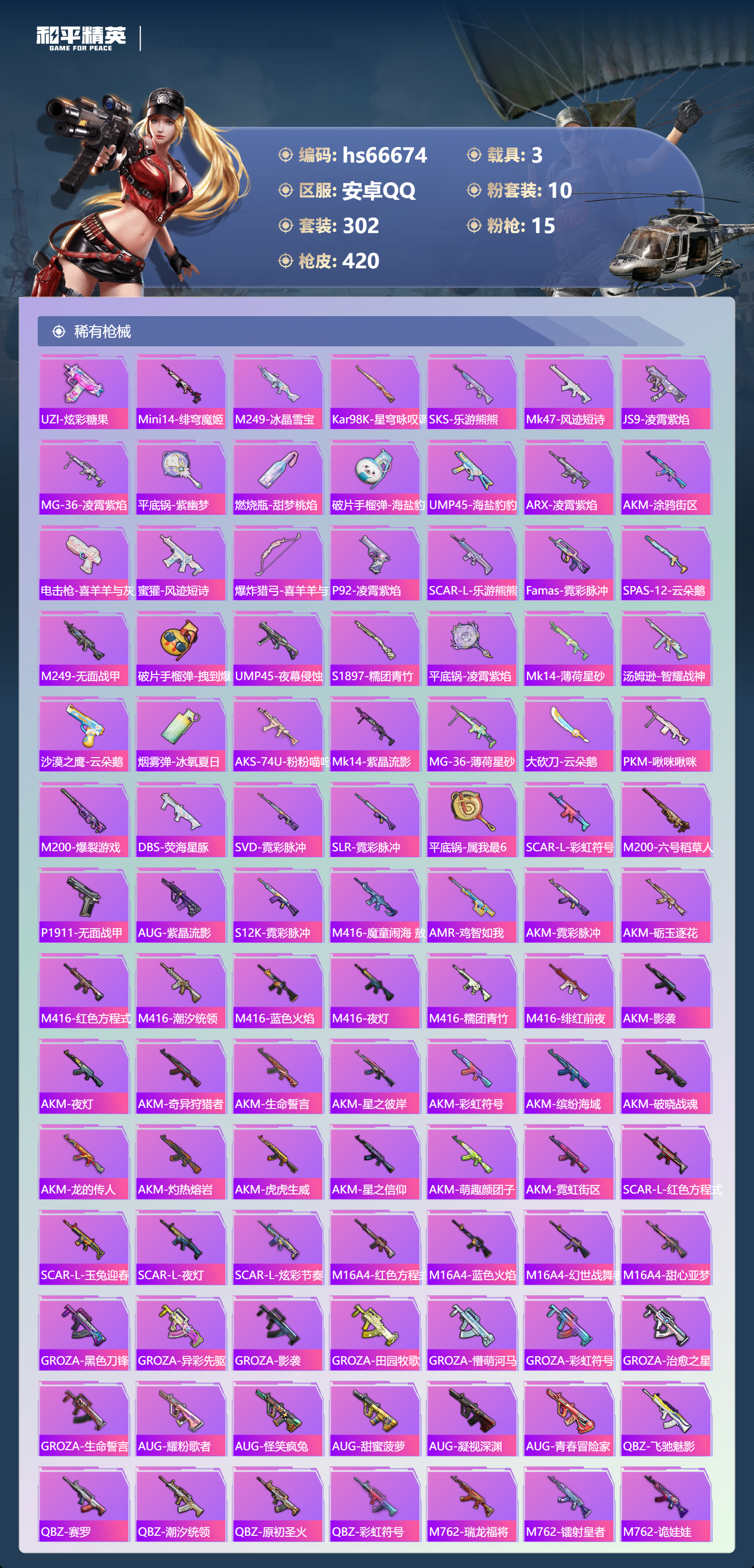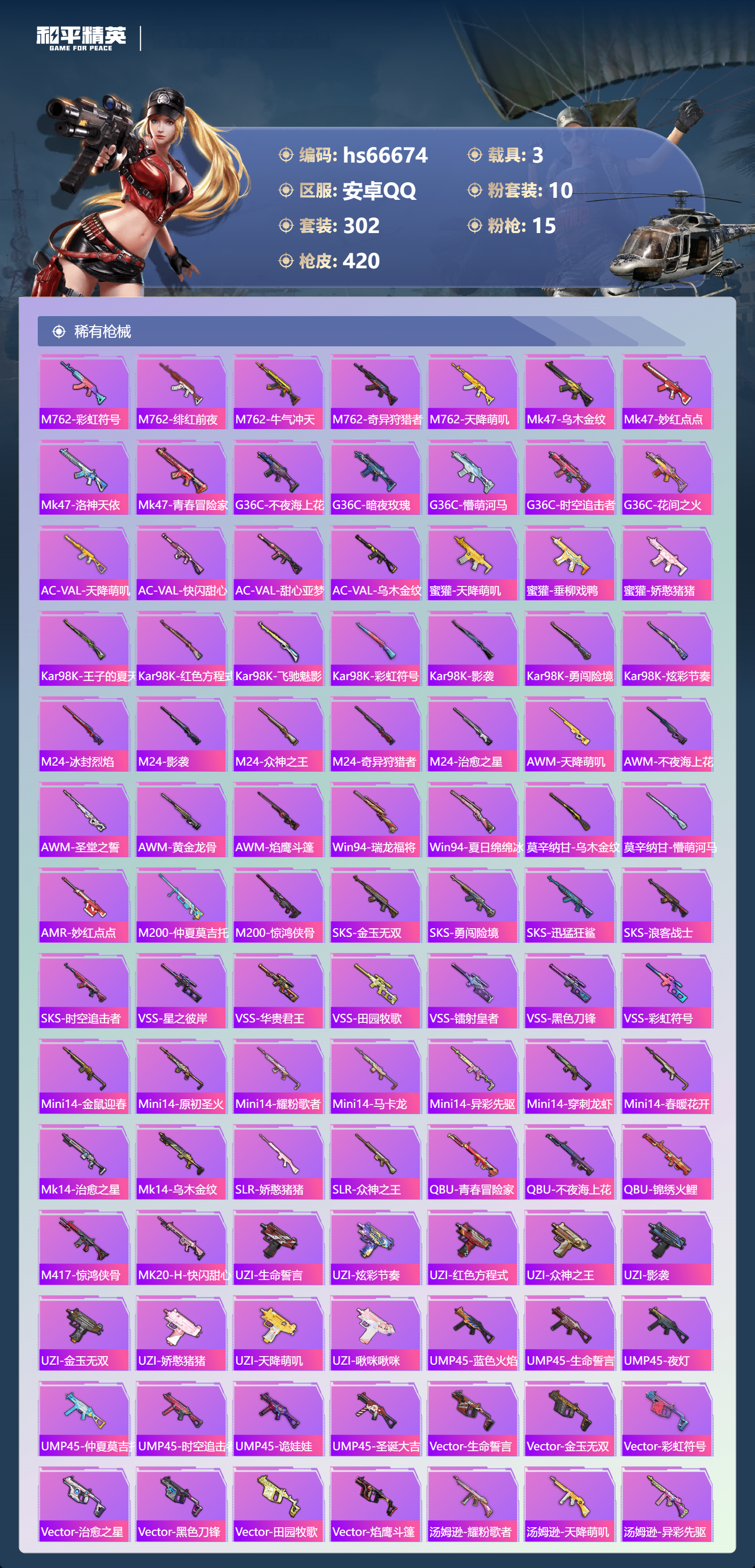 hs66674安卓手Q-21王牌印记-10粉装-15特效枪-3载具-热力值-302套装-420枪皮-3卓越印记