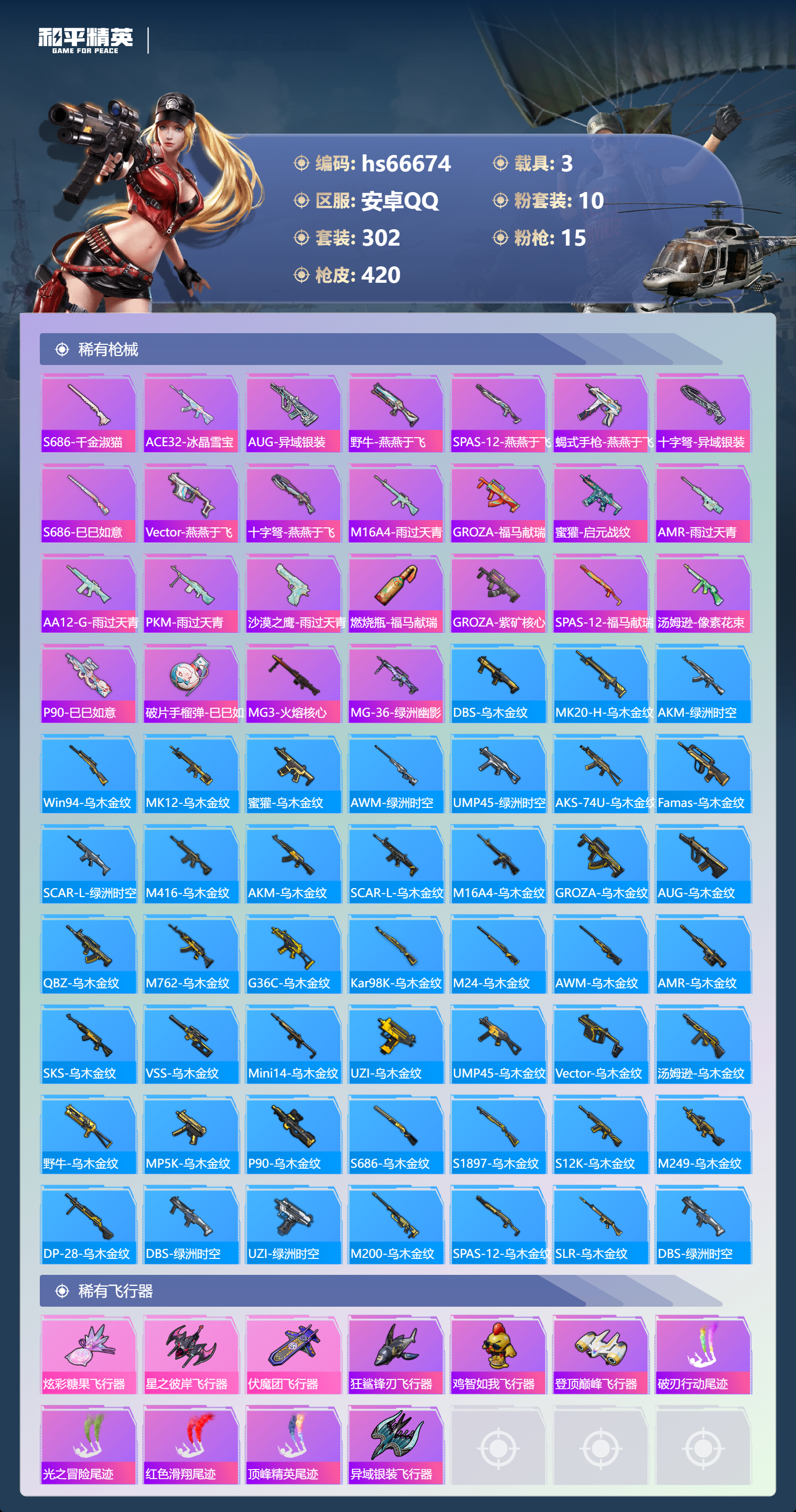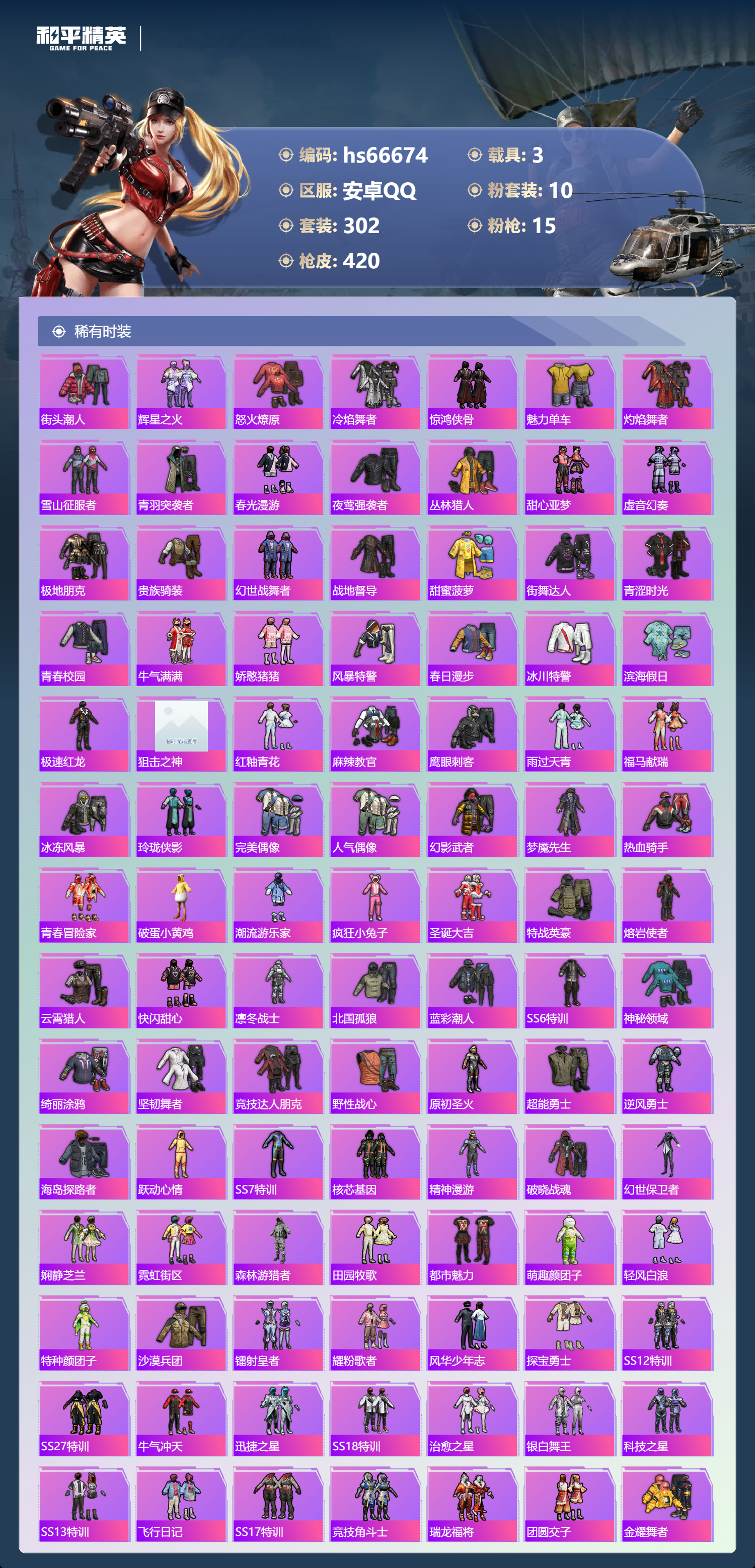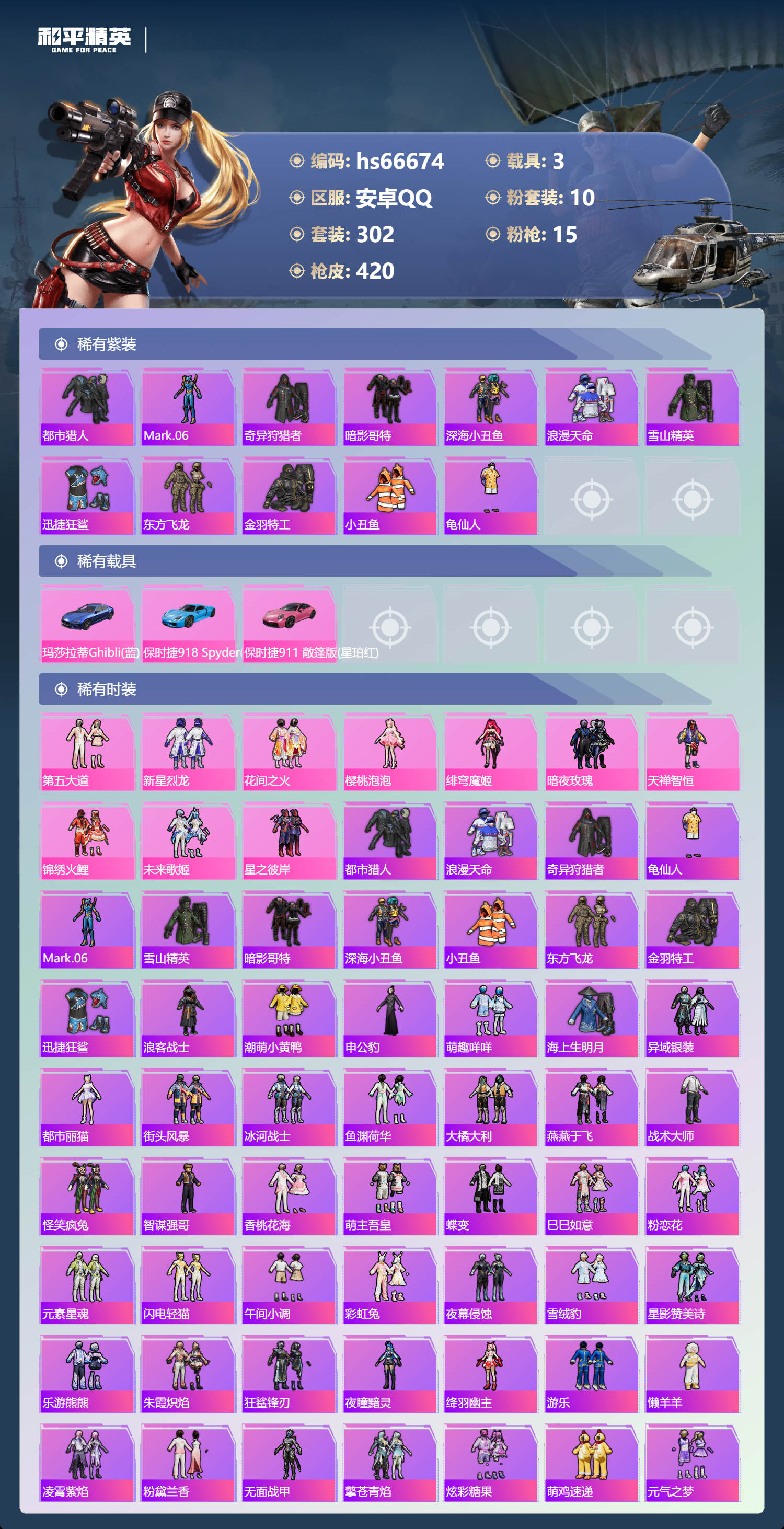 hs66674安卓手Q-21王牌印记-10粉装-15特效枪-3载具-热力值-302套装-420枪皮-3卓越印记