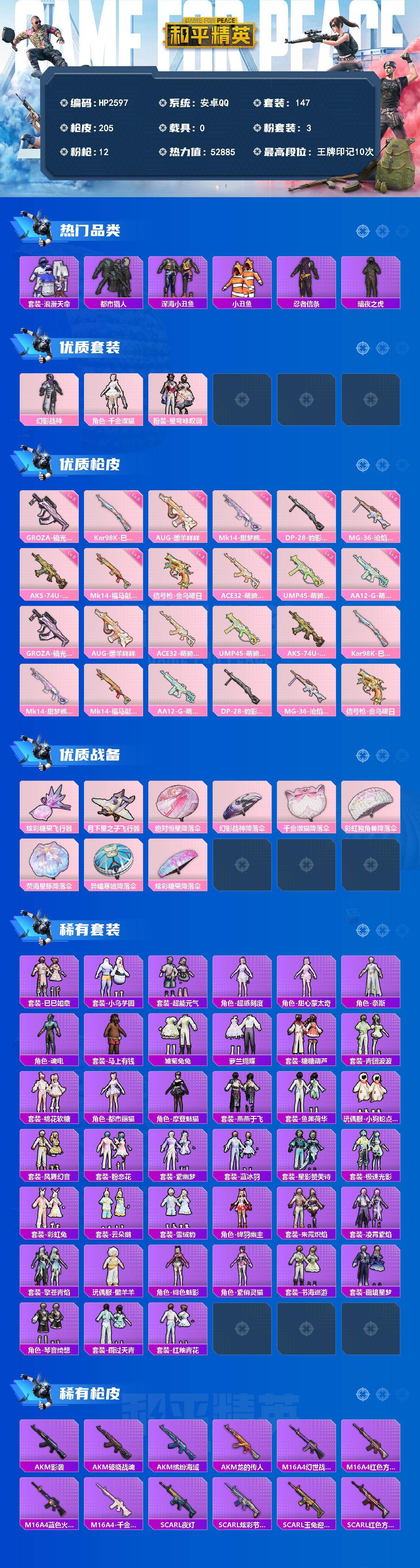 【HP2597】147套装/枪械12/装备243/战备134/王牌印记10/热力值52885/五级GROZA-镜光银凌/五级AUG-暖羊咩咩/三级ACE32-萌骑漫游/三级UMP45-萌骑冒险/五级AKS-74U-森灵之息/五级Kar98K-巳巳如意/五级Mk14-甜梦熊击/五级Mk14-福马献瑞/二级AA12-G-萌骑幻想/五级DP-28-豹影疾电/五级MG-36-沧焰双生/三级信号枪-金乌曜日/套装-浪漫天命/套装-都市猎人/套装-深海小丑鱼/套装-小丑鱼/套装-忍者信条/套装-暗夜之虎/粉