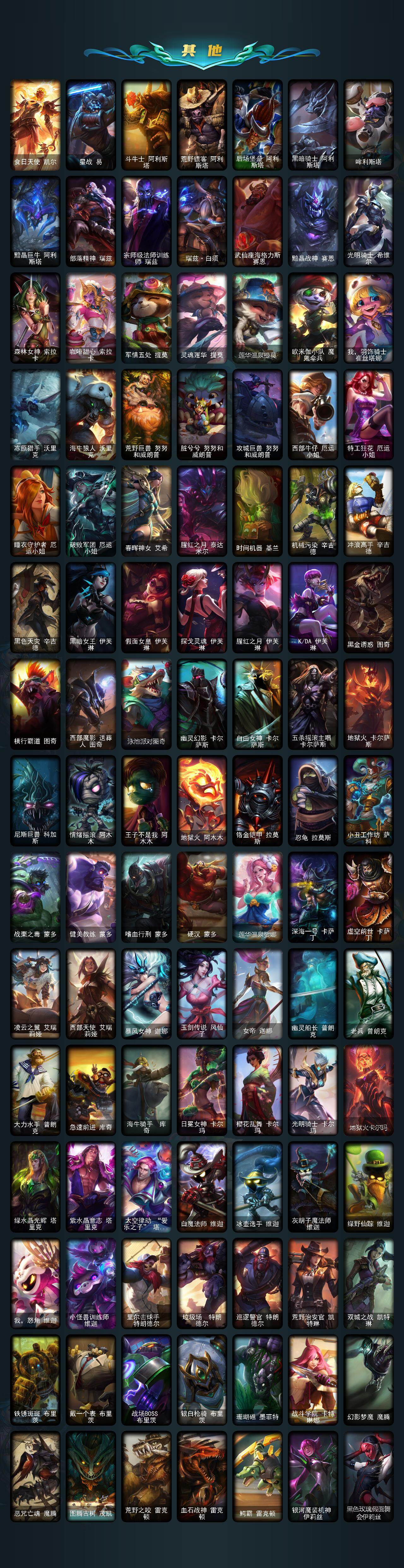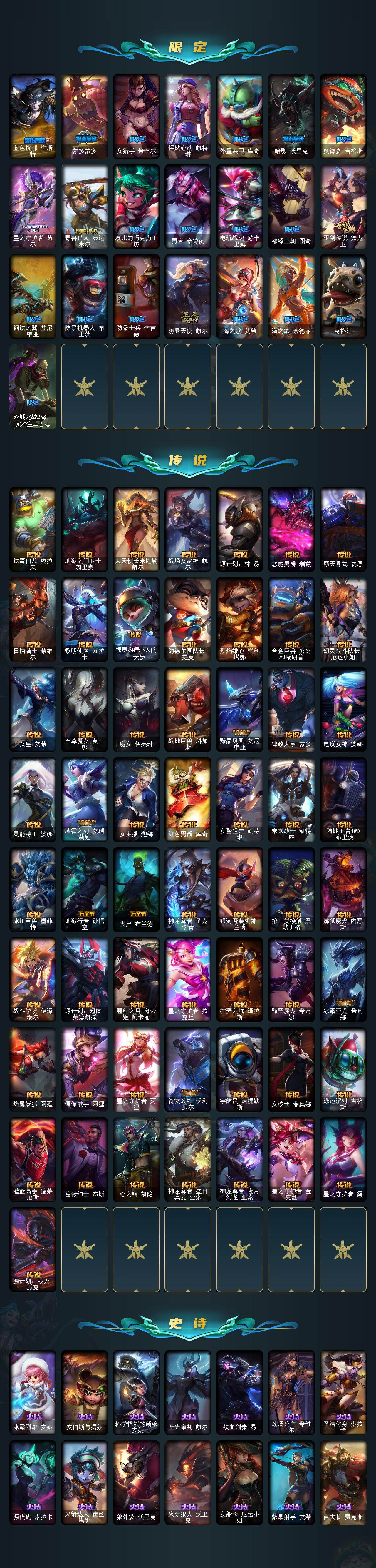 【至臻皮肤】:至臻魔女乐芙兰,至臻星之守护者索拉卡,至臻绝息圣堂厄运小姐,至臻KDA伊芙琳,至臻玉剑传说琴仙子娑娜,至臻黑色玫瑰假面舞会卡特琳娜,至臻焰执事布兰德,至臻天龙之子伊泽瑞尔,至臻灵魂莲华拉克丝,至臻青花瓷丽桑卓,至臻KDA卡莎,至臻海之歌萨勒芬妮,至臻真实伤害赛娜,至臻真实