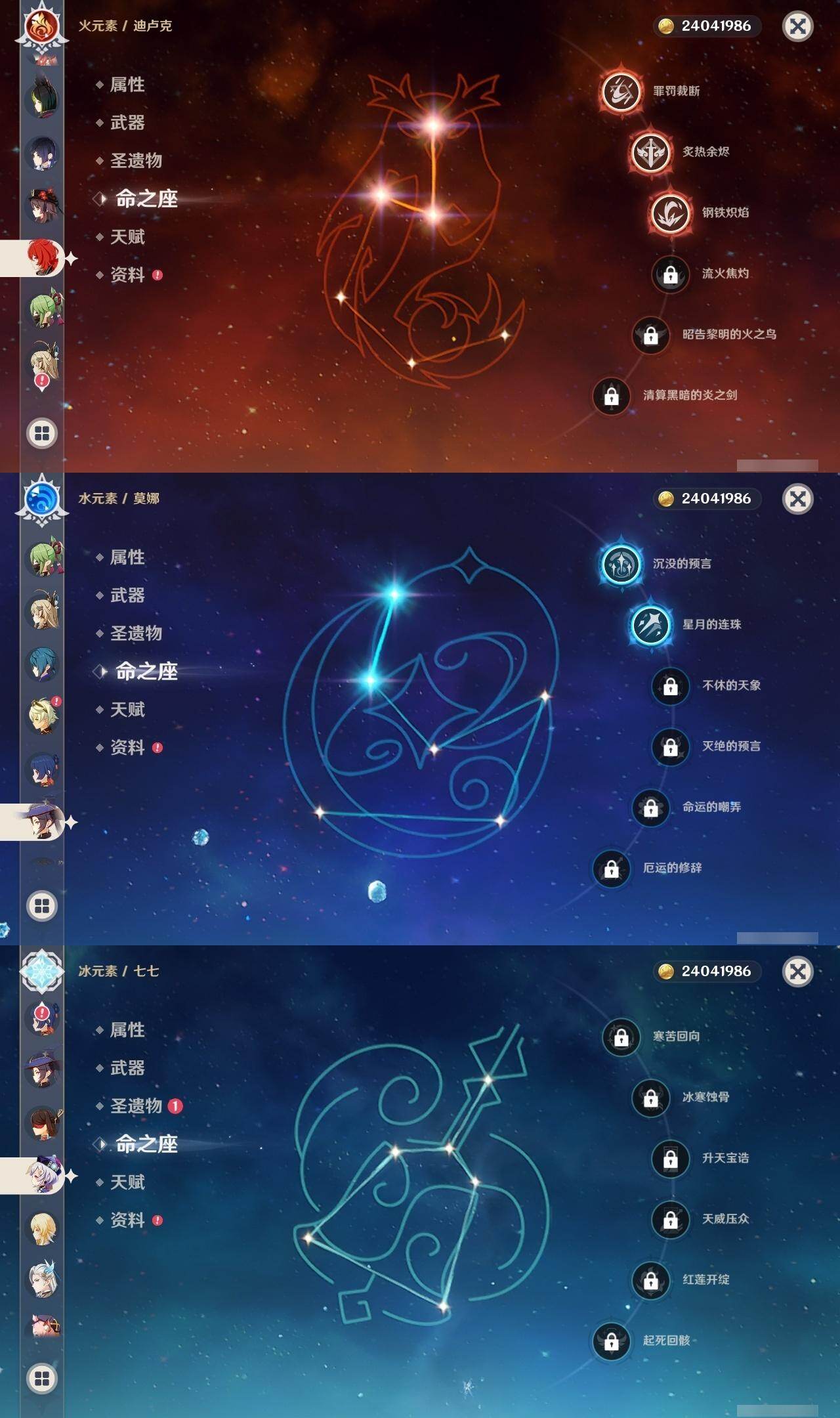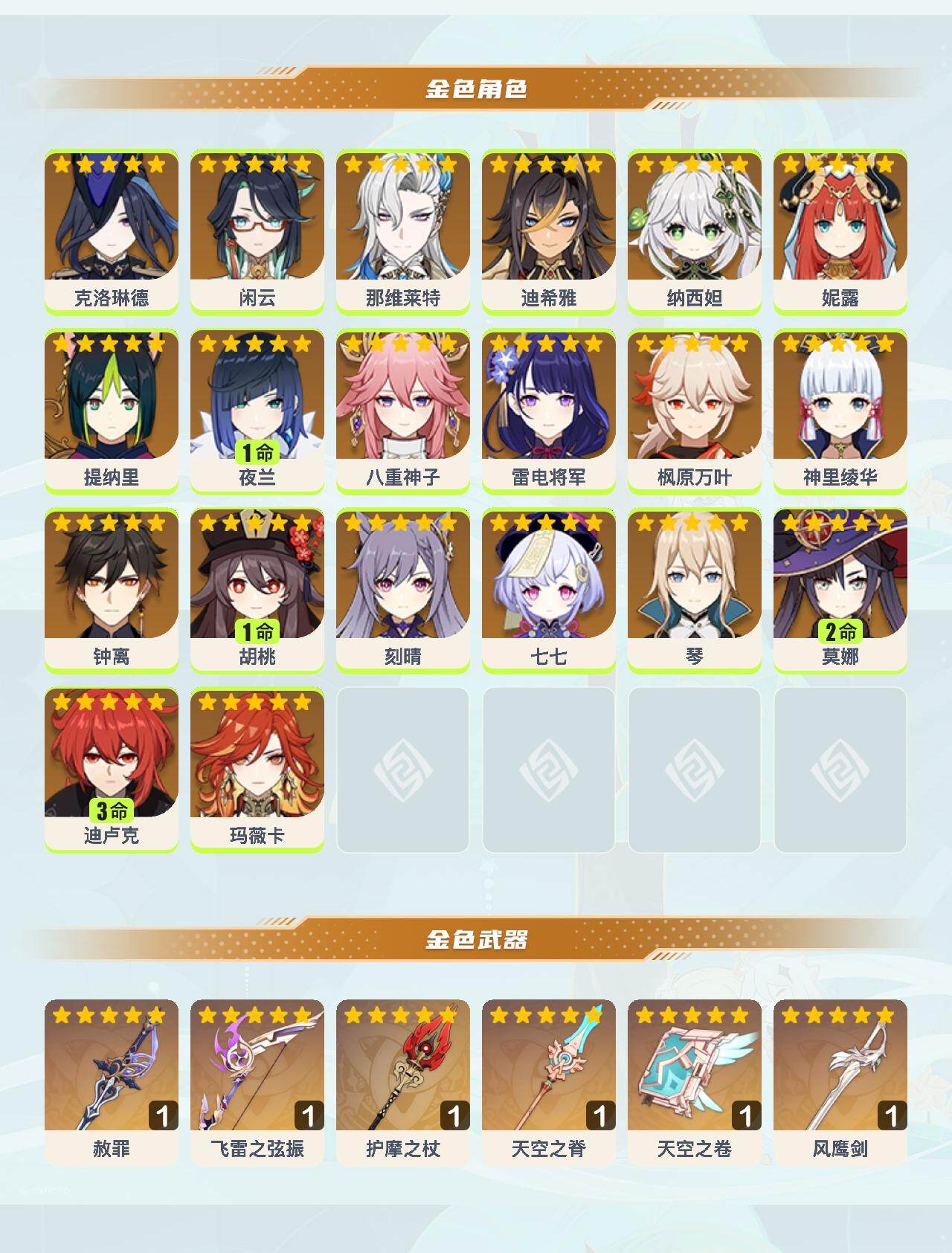 0命克洛琳德,0命闲云,0命那维莱特,0命迪希雅,0命纳西妲,0命妮露,0命提纳里,1命夜兰,0命八重神子,0命雷电将军,0命枫原万叶,0命神里绫华,0命钟离,1命胡桃,0命刻晴,0命七七,0命琴,2命莫娜,3命迪卢克,0命玛薇卡,精1赦罪,精1飞雷之弦振,精1护摩之杖,精1天空之脊,精1天空之卷,精1风鹰剑