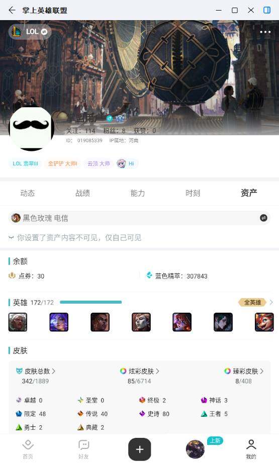 未定级段位-172英雄-342皮肤-85炫彩-2终极-3神话-48限定-40传说-80史诗