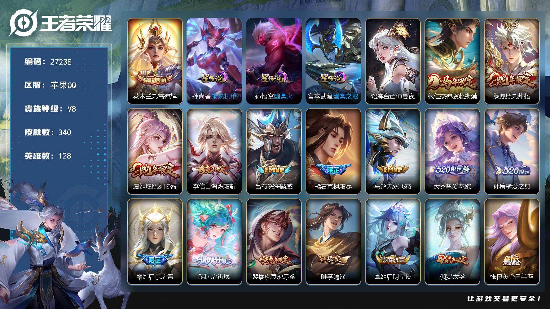 可换绑【特价精品号·花木兰典藏·狄仁杰马限·虞姬澜蛇限·炽霜斩·枫霜尽·大乔孙策520限定·瑶时之祈愿·启示之音·李逍遥·太华·白虎志·武陵仙君·凤求凰·玄木吟·玉兔公主·孙行者·后羿如梦令·飞衡·大圣娶亲·青龙志·青春决赛季·至尊宝·凤凰于飞·虞姬霸王别姬·无二次包过】19按键 1天幕,4星传说,15王者印记,满级铭文 无二次包过CD18956 苹果Q-V8-340皮肤-1典藏皮肤-27传说-90史诗【英雄全皮】:刘邦全皮,狂铁全皮【荣耀典藏】:花木兰九霄神辉【星元皮肤】:孙尚香未来机甲,孙悟