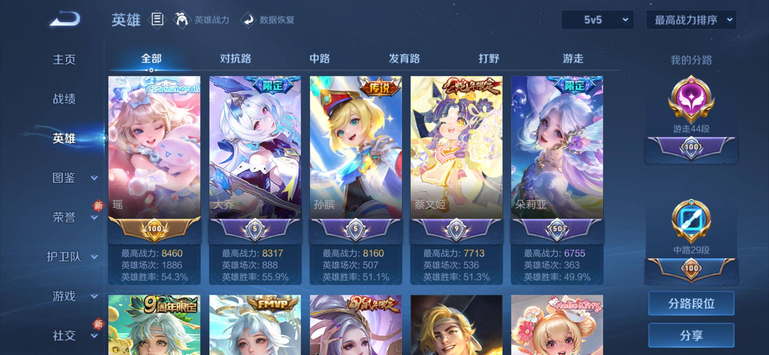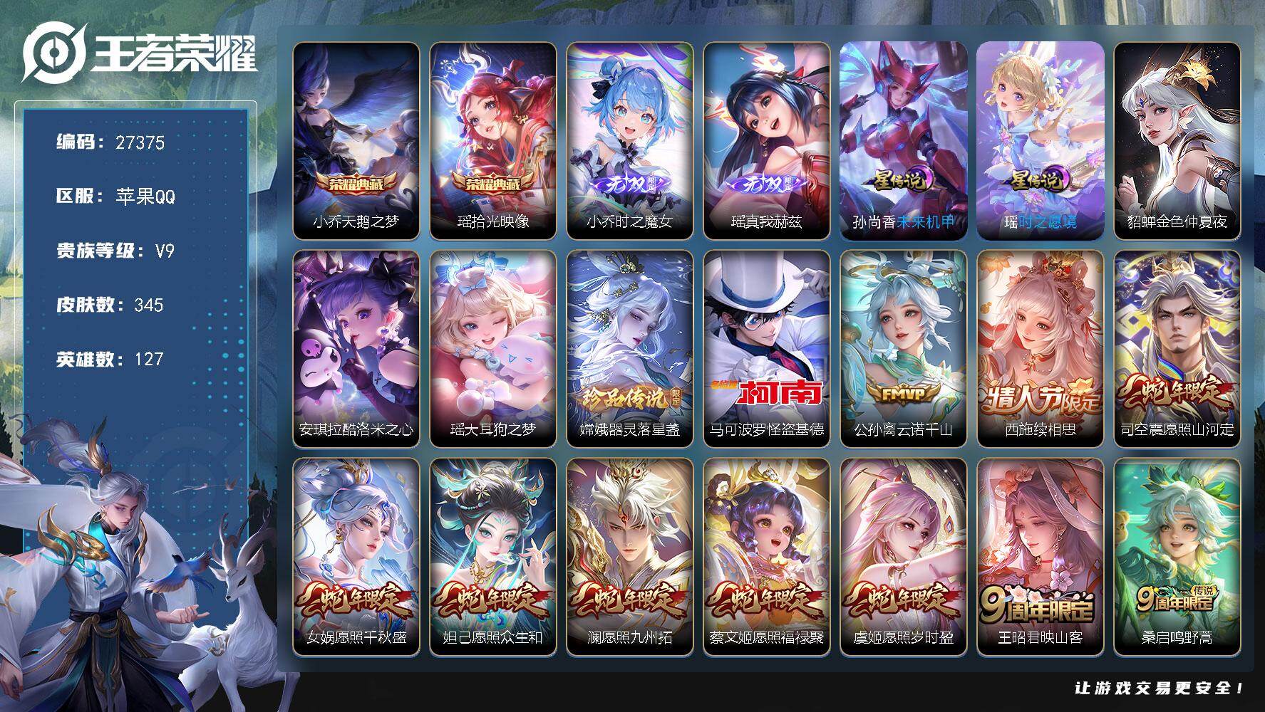 可换绑【V9极品女号·瑶大乔西施嫦娥全皮·金标瑶·游走44段·蛇年全套·2无双·
