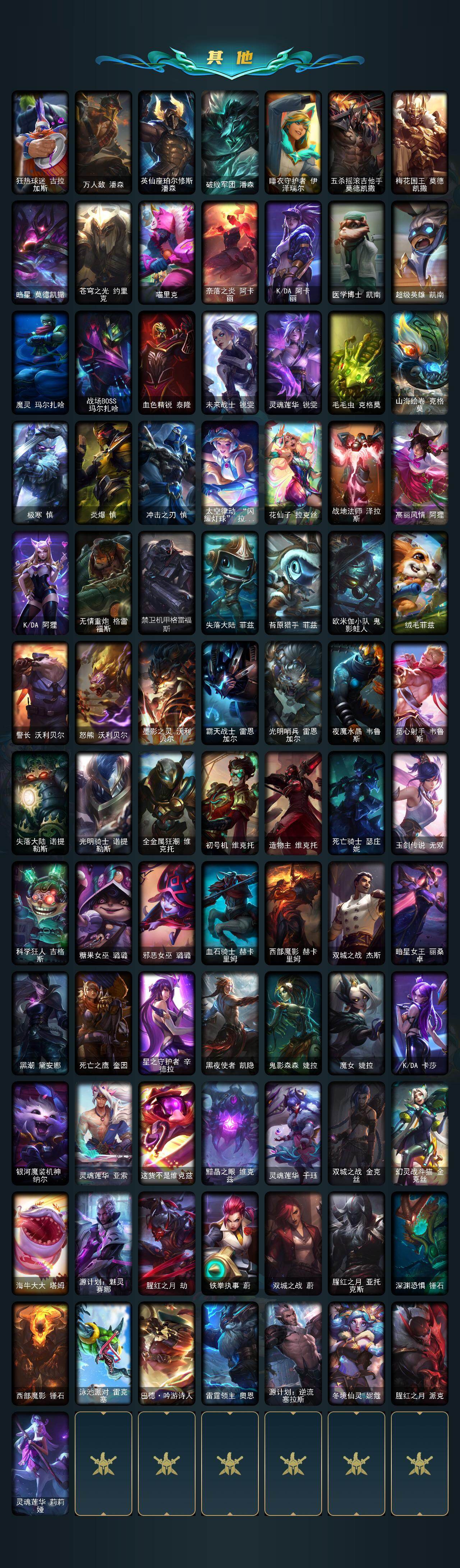 【至臻皮肤】:至臻魔女乐芙兰,至臻魅惑女巫莫甘娜,至臻灵能特工伊泽瑞尔,至臻KDA阿卡丽,至臻KDA阿卡丽(2022),至臻青花瓷拉克丝,至臻神龙尊者均衡之龙沃利贝尔,至臻星之守护者辛德拉,至臻魔女婕拉,至臻幻灵战斗猫金克丝,至臻星之守护者艾克