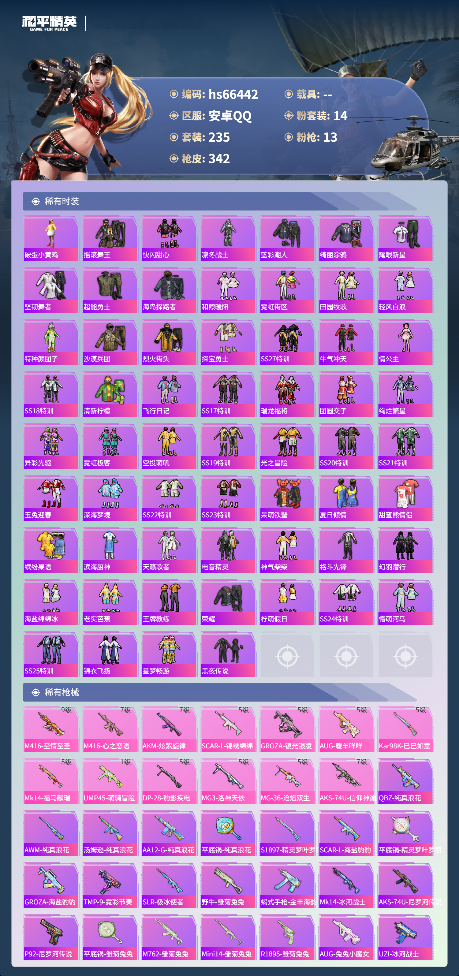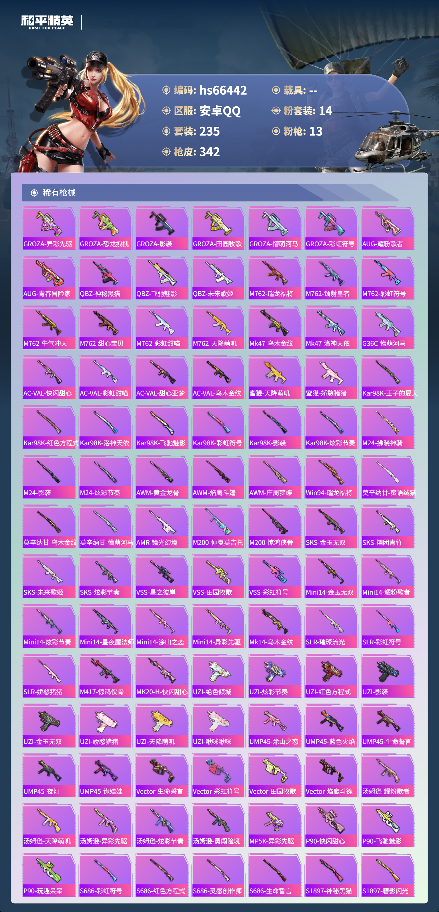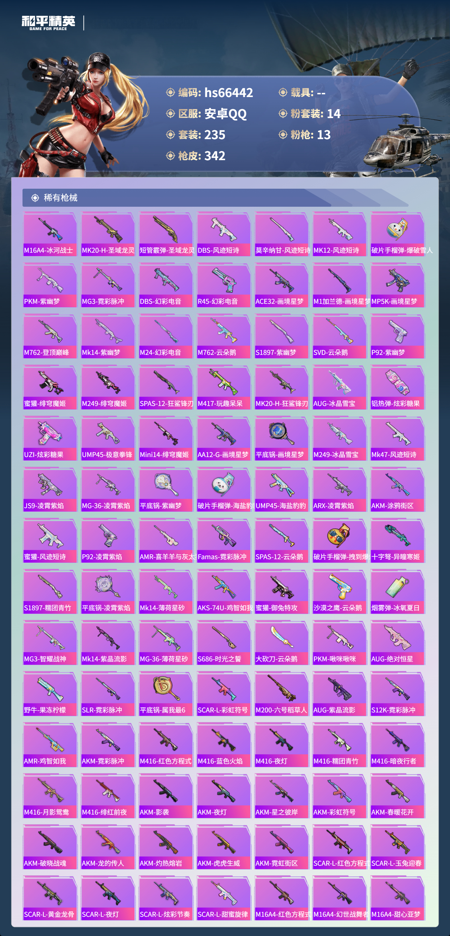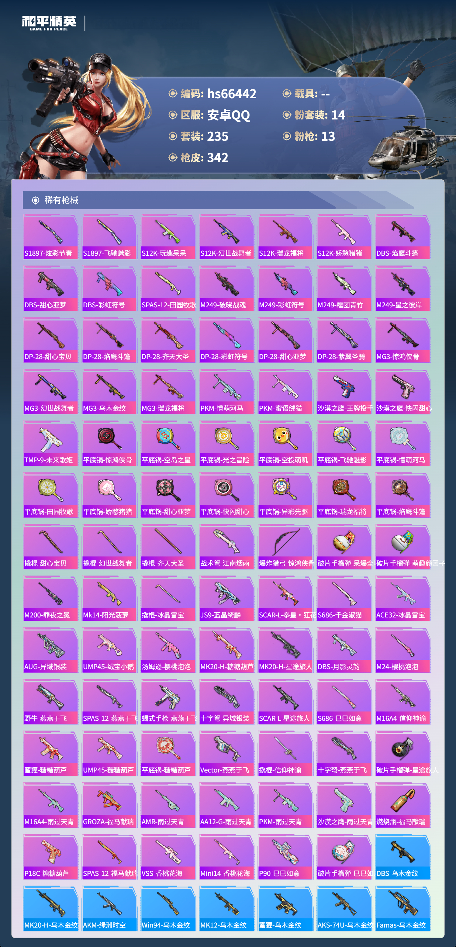 hs66442 安卓手Q-18王牌印记-14粉装-13特效枪-热力值-235套装-342枪皮-4卓越印记-1传奇印记