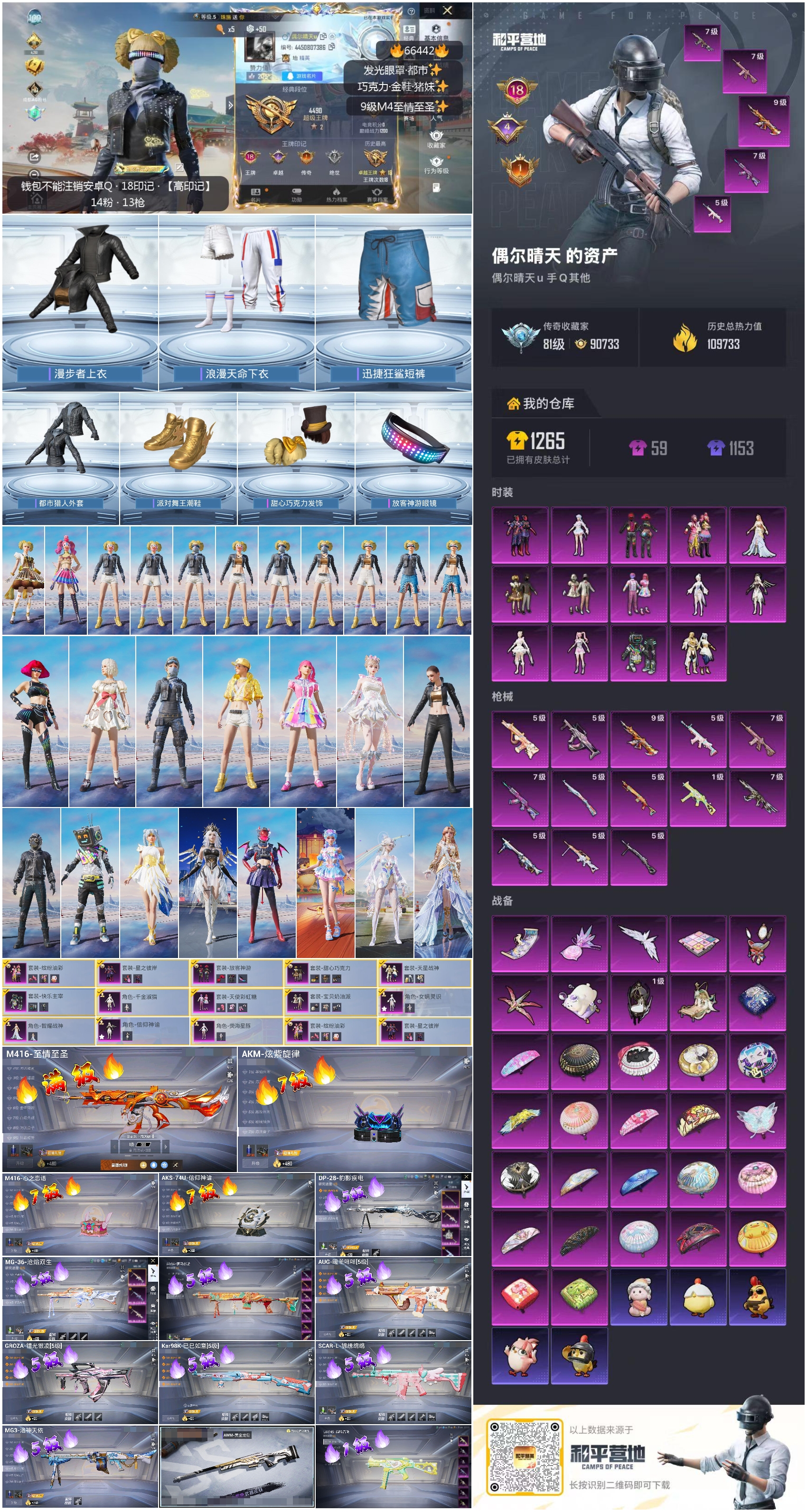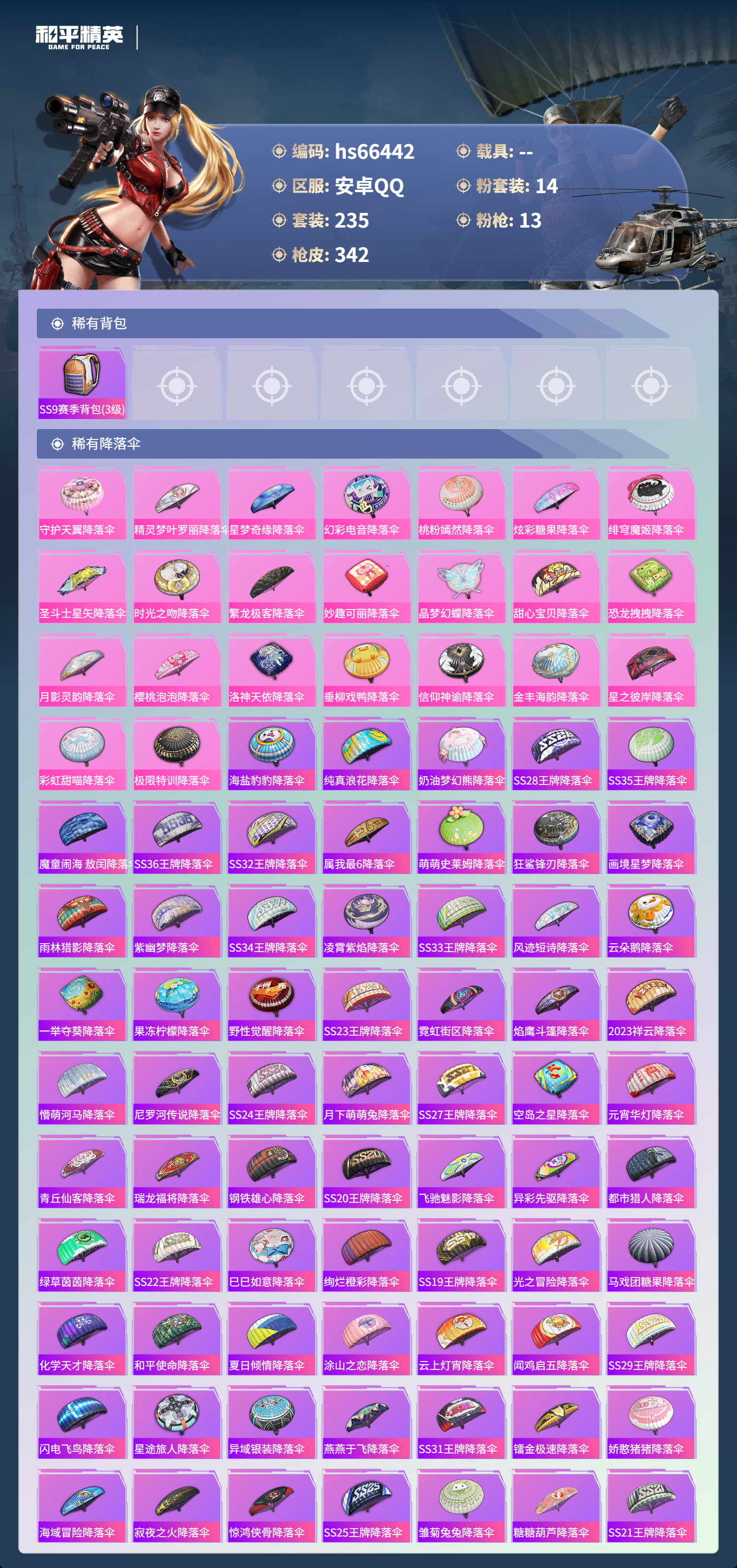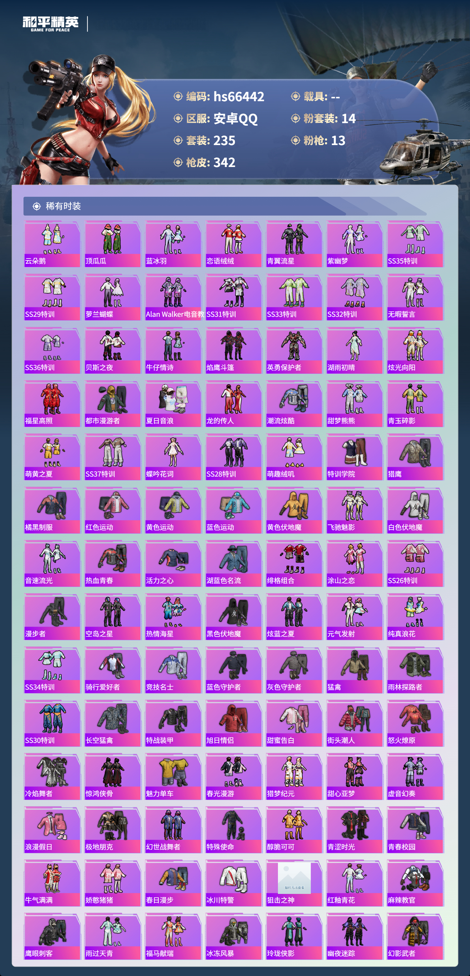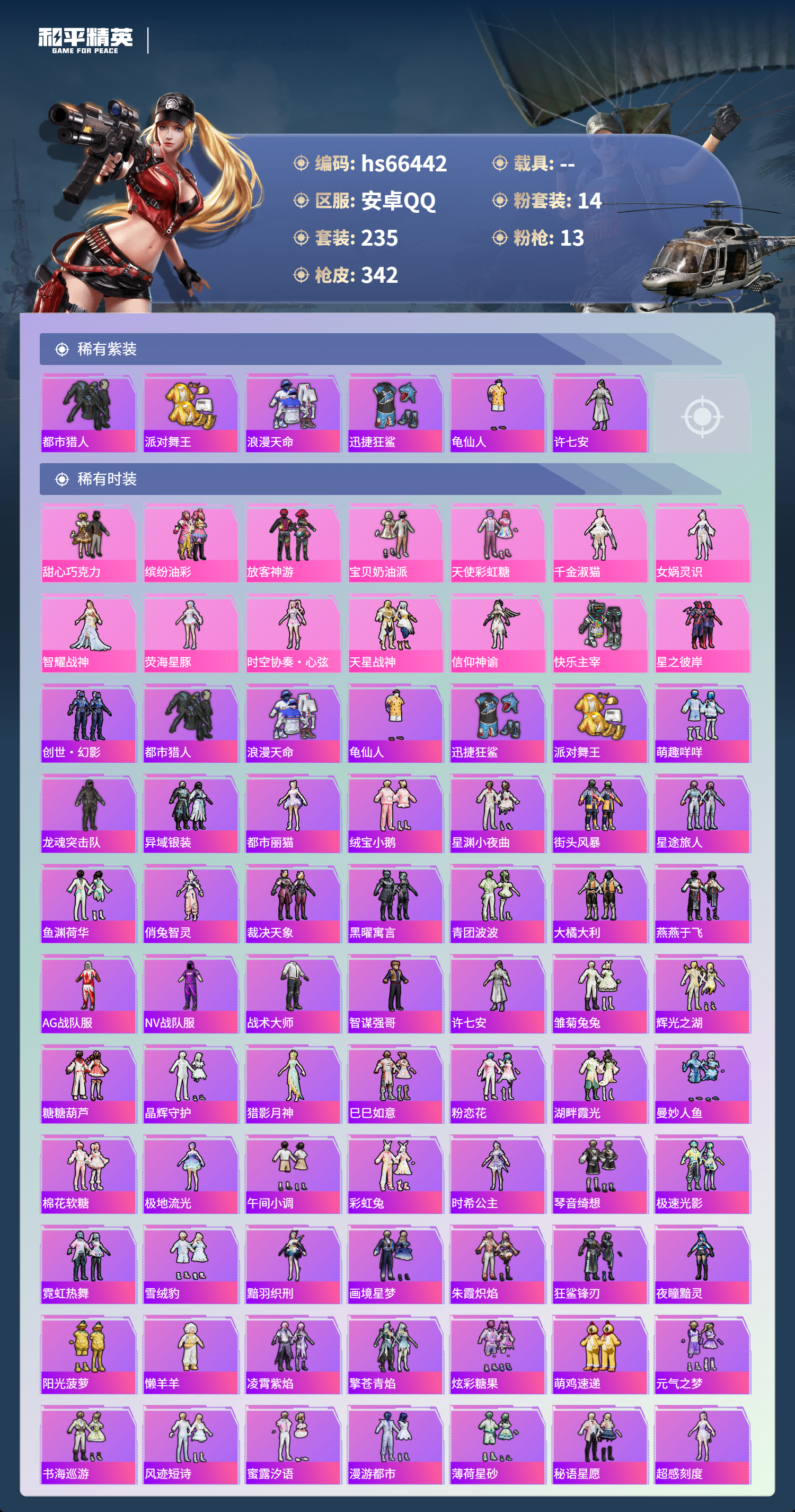 hs66442 安卓手Q-18王牌印记-14粉装-13特效枪-热力值-235套装-342枪皮-4卓越印记-1传奇印记