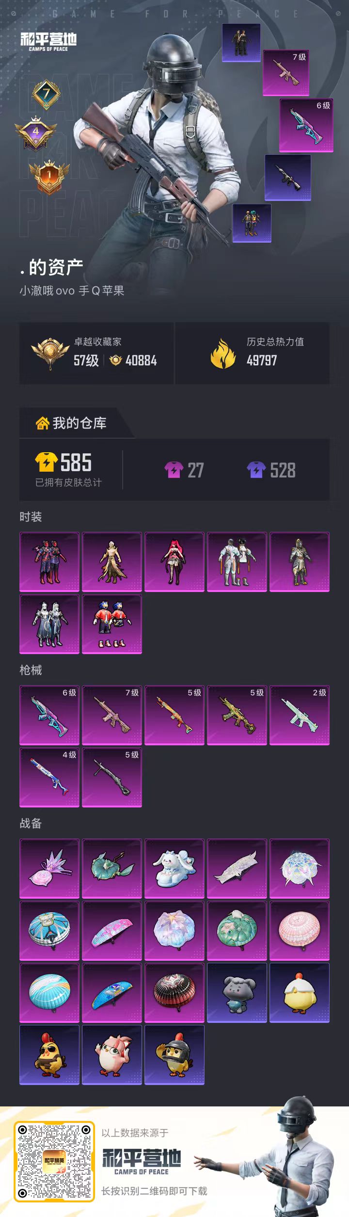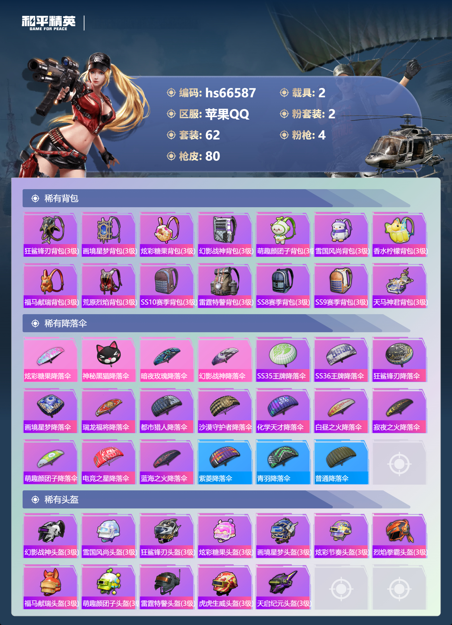 hs66587 苹果手Q-3王牌印记-2粉装-4特效枪-2载具-29632热力值-62套装-80枪皮-1卓越印记