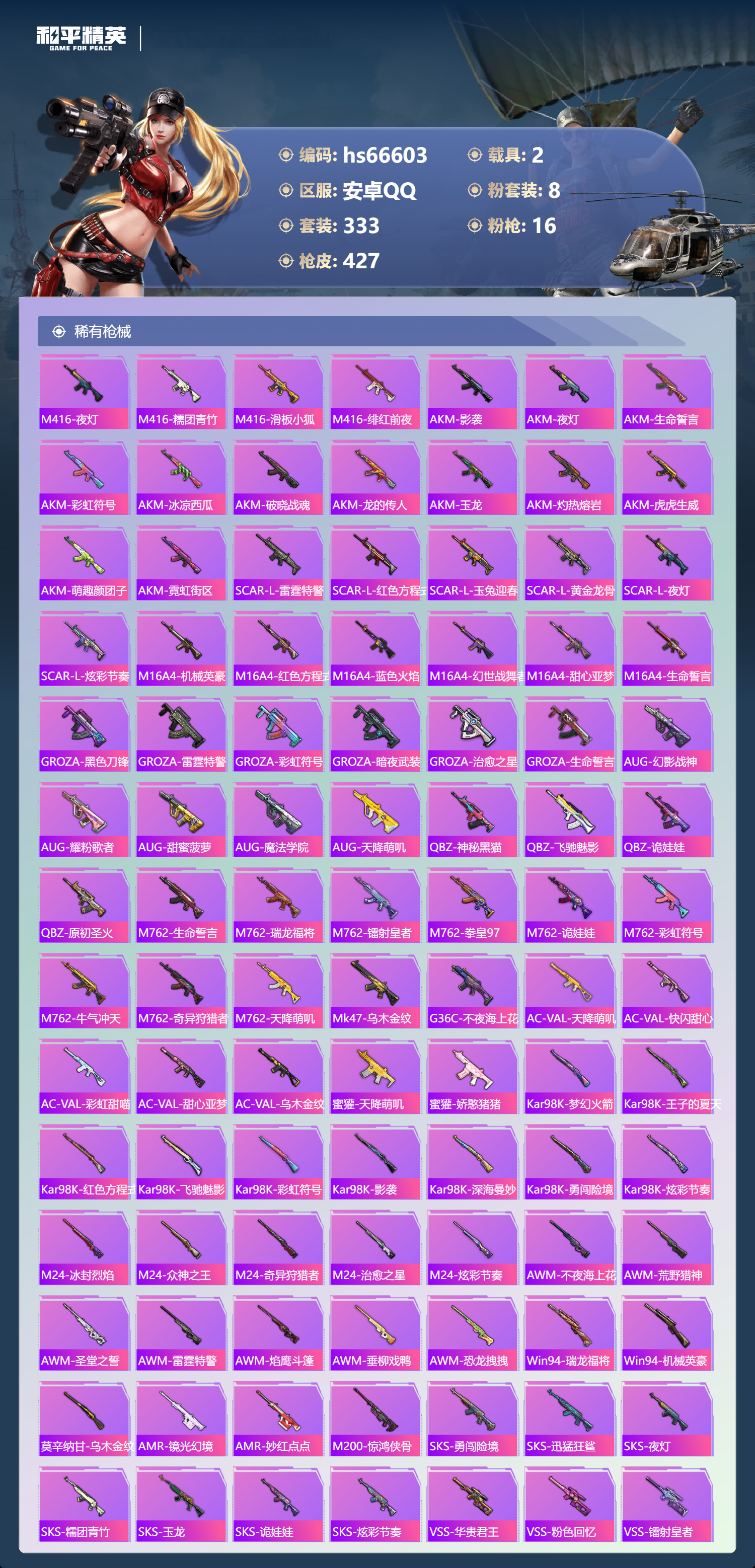 hs66603 安卓手Q-15王牌印记-8粉装-16特效枪-2载具-热力值-333套装-427枪皮-8卓越印记-2传奇印记