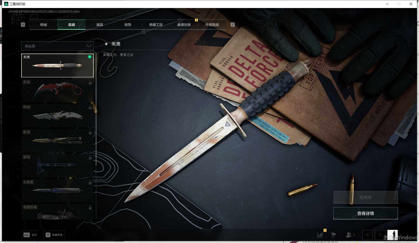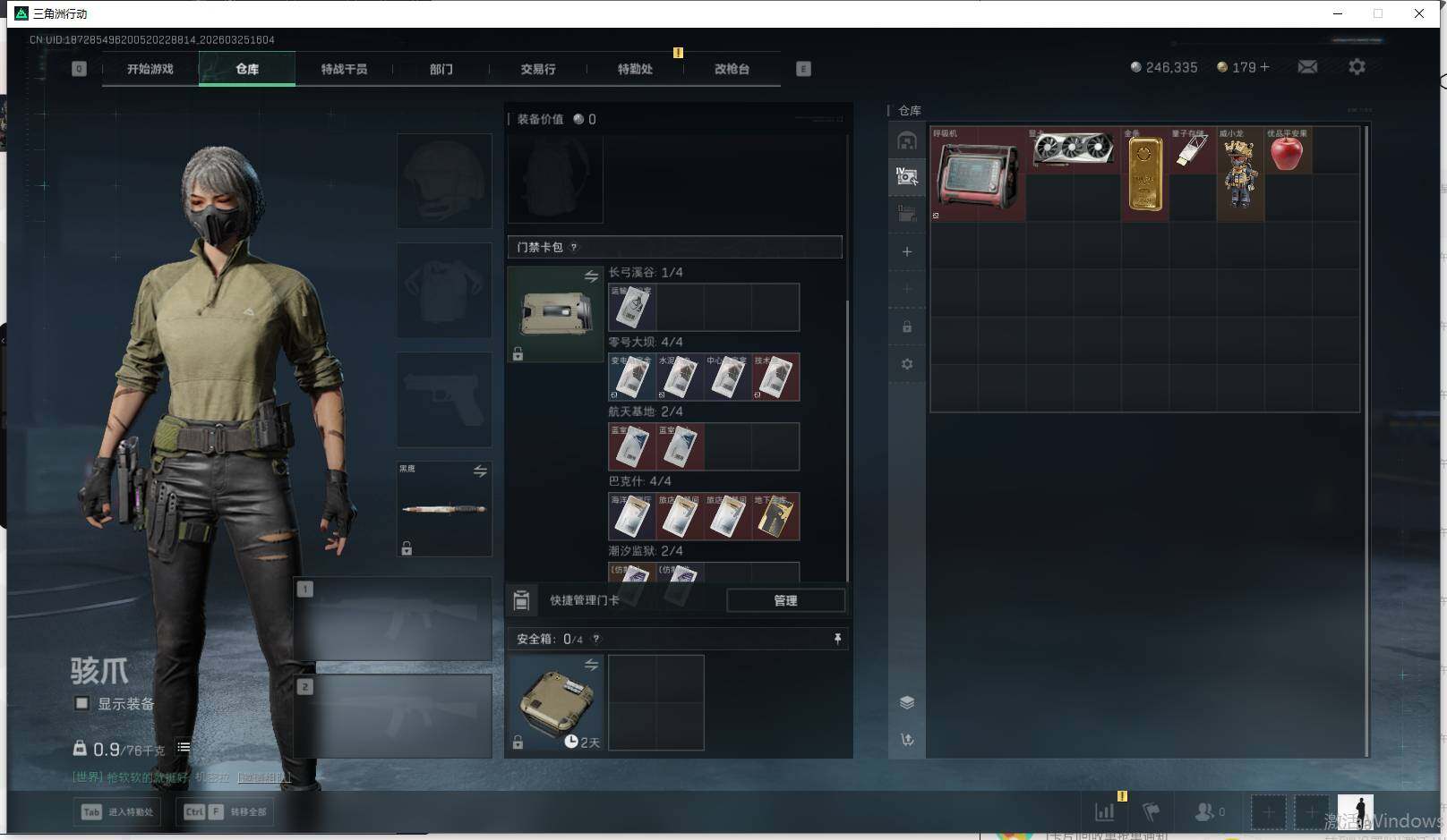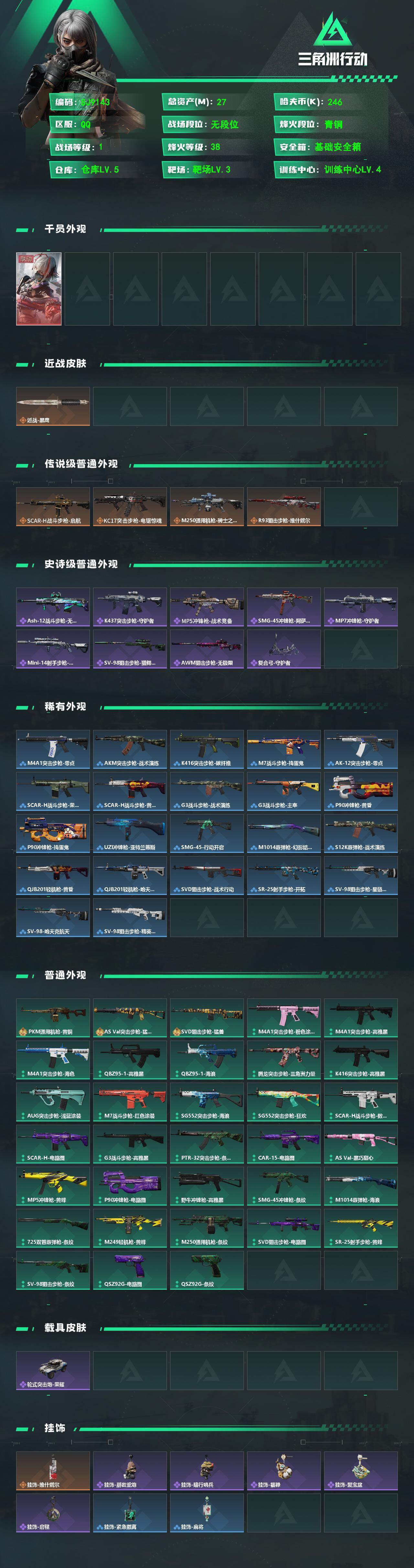 总资产(M):27M/哈夫币(K):246K/传说枪皮数:4/全面战场等级:1_段位:无段位/烽火地带等级:38_段位:青铜/骇爪-维什戴尔/近战-黑鹰/