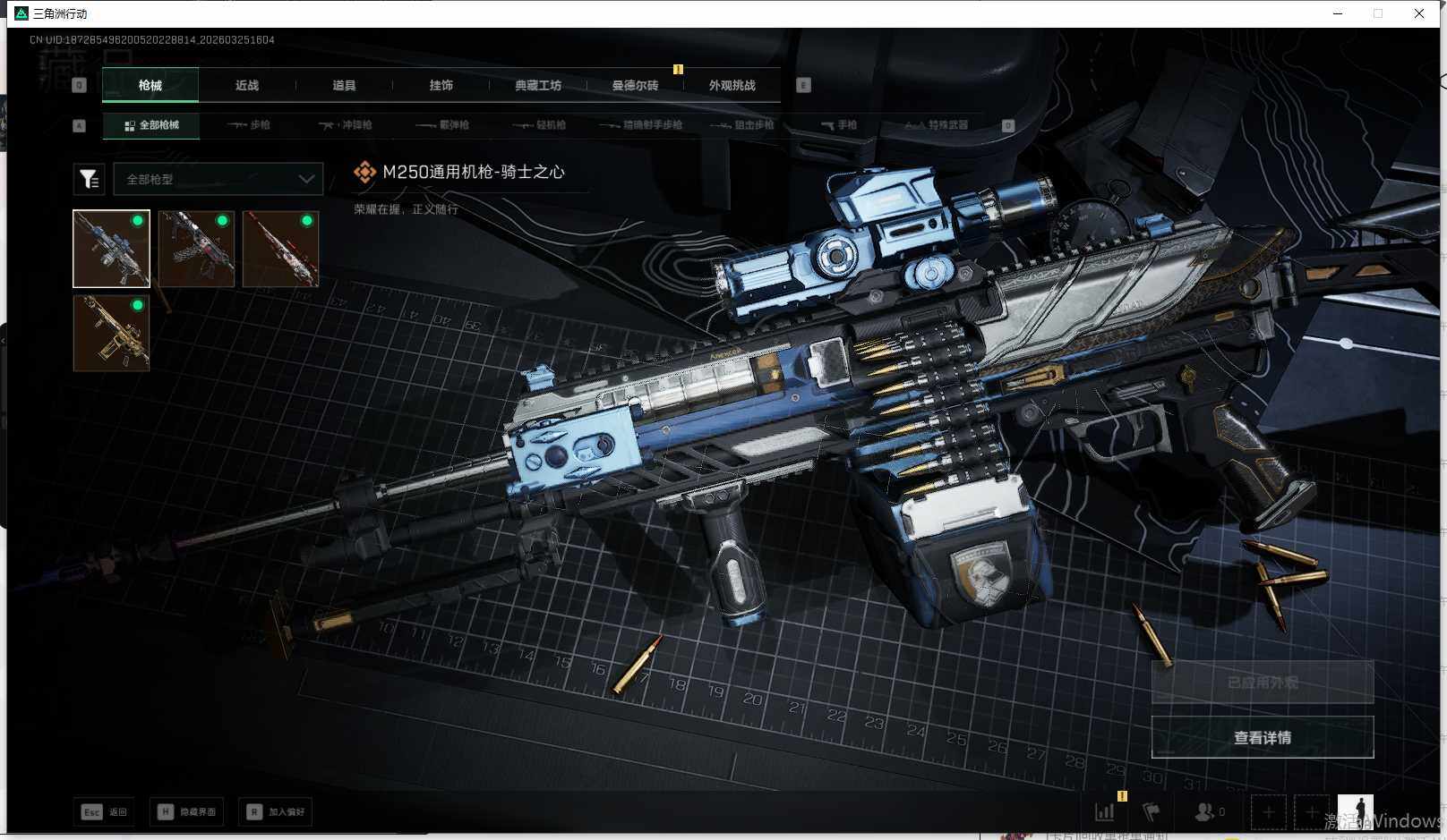 SCAR-H战斗步枪-启航/KC17突击步枪-电锯惊魂/M250通用机枪-骑士之心/R93狙击步枪-维什戴尔/ASh-12战斗步枪-无极限/K437突击步枪-守护者/MP5冲锋枪-战术竞备/SMG-45冲锋枪-阿萨拉特攻/MP7冲锋枪-守护者/Mini-14射手步枪-守护者/SV-98狙击步枪-猎鳄行动/AWM狙击步枪-无极限/复合弓-守护者/M4A1突击步枪-零点/AKM突击步枪-战术演练/