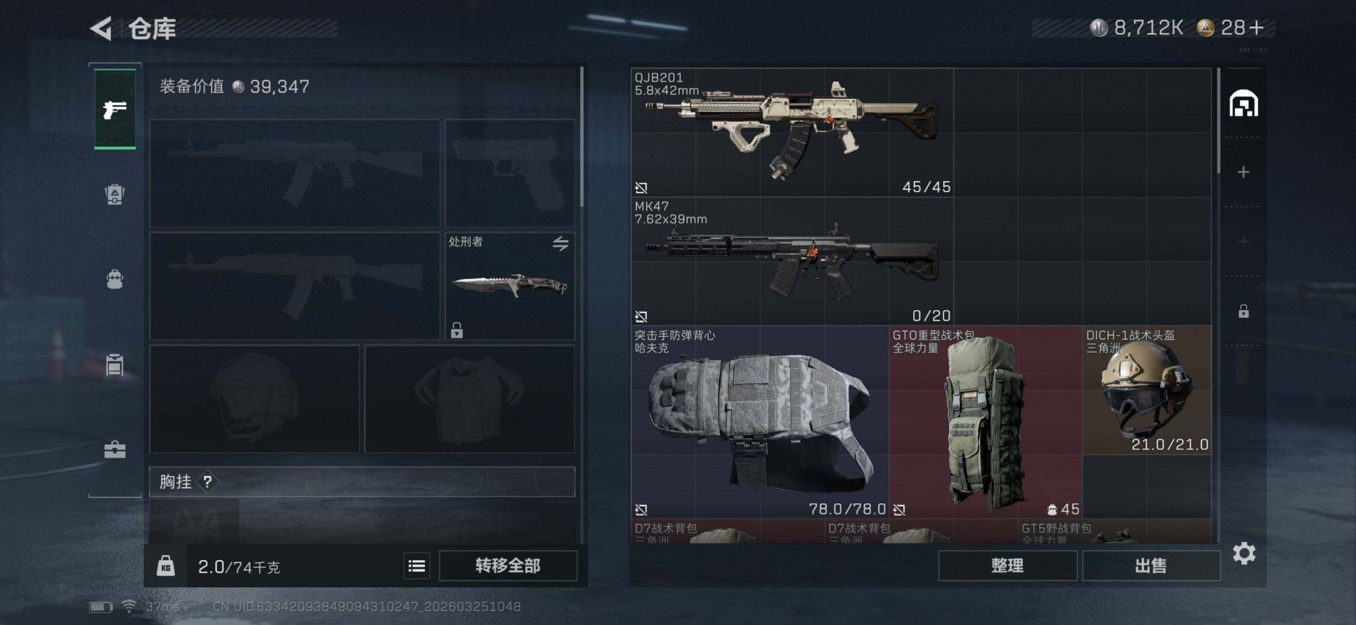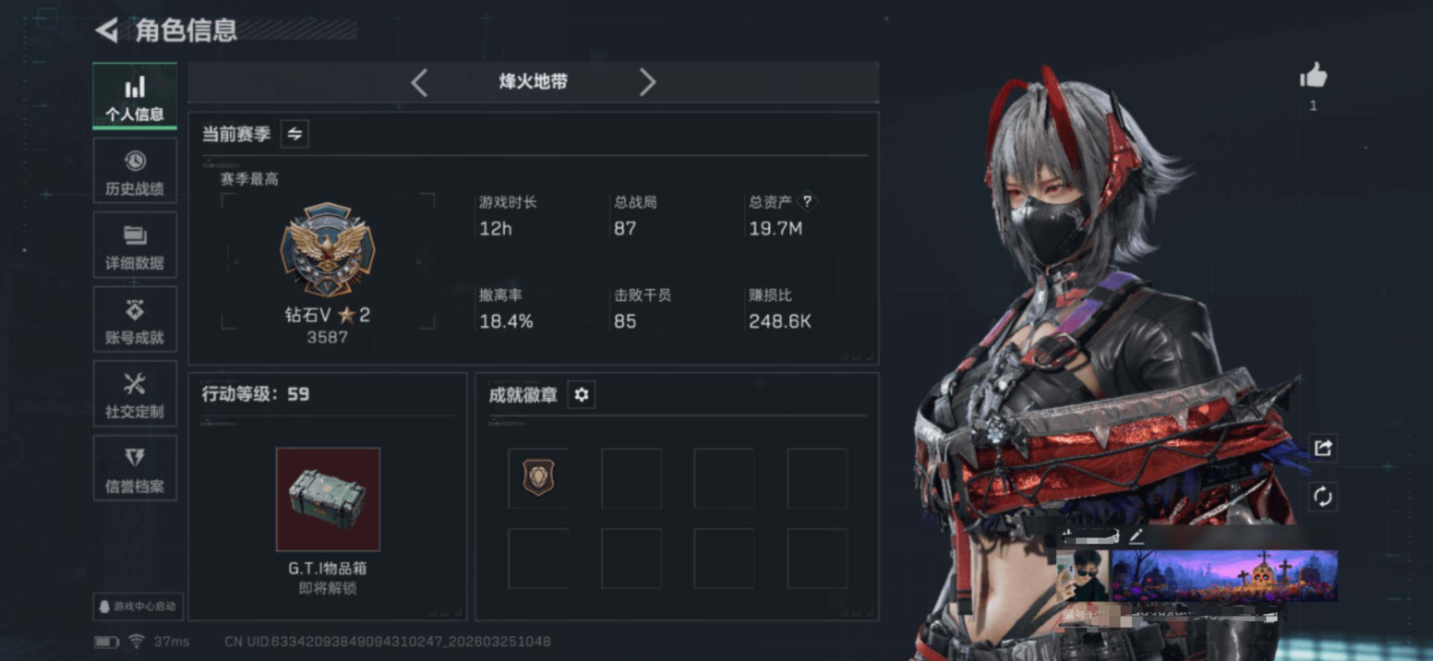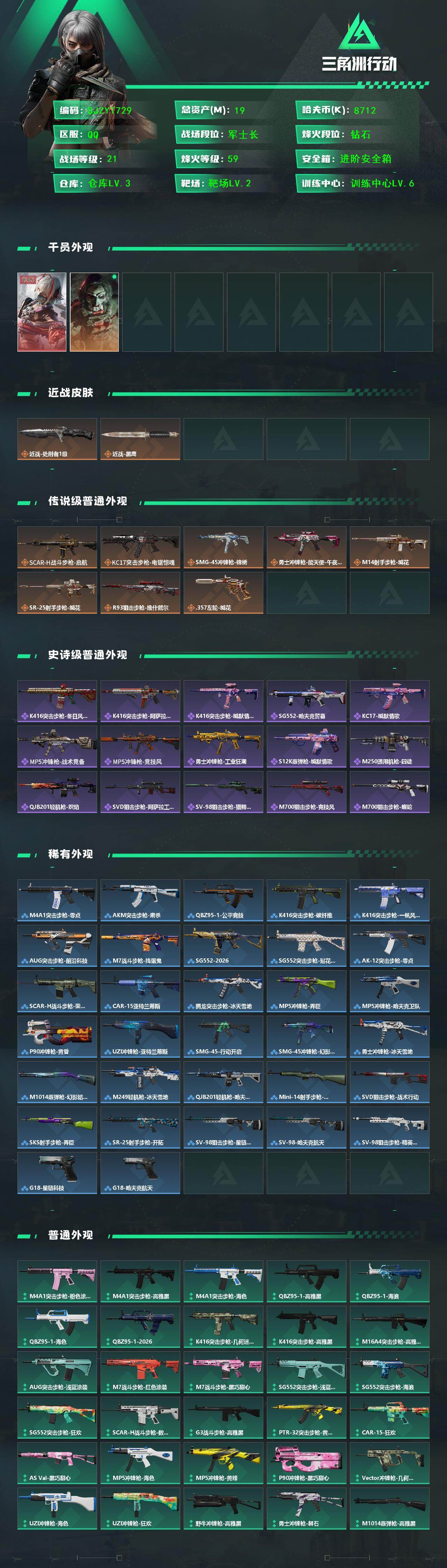 总资产(M):19M/哈夫币(K):8712K/传说枪皮数:8/全面战场等级:21_段位:军士长/烽火地带等级:59_段位:钻石/骇爪-维什戴尔/红狼-电锯惊魂/近战-处刑者1级/近战-黑鹰/
