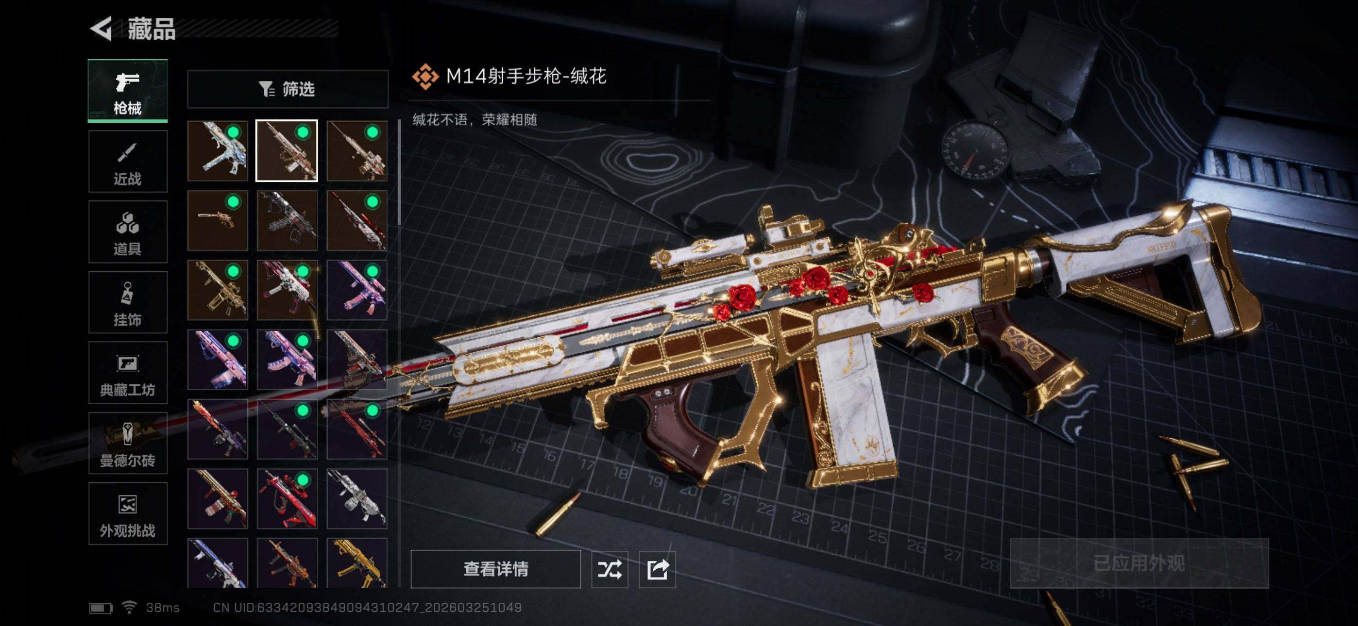 SCAR-H战斗步枪-启航/KC17突击步枪-电锯惊魂/SMG-45冲锋枪-锦绣/勇士冲锋枪-能天使-午夜邮差/M14射手步枪-缄花/SR-25射手步枪-缄花/R93狙击步枪-维什戴尔/.357左轮-缄花/K416突击步枪-冬日风情/K416突击步枪-阿萨拉特攻/K416突击步枪-缄默情歌/SG552突击步枪-哈夫克警备/KC17突击步枪-缄默情歌/MP5冲锋枪-战术竞备/MP5冲锋枪-竞技风/