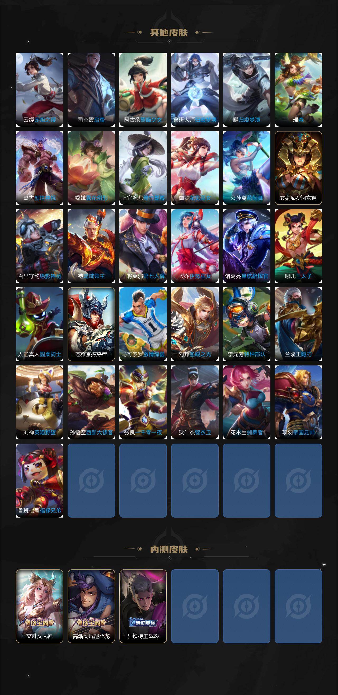 【传说皮肤】:狄仁杰神骥赴朔漠,后羿神树通天,司空震愿照山河定,云缨幻光神枪,桑启鸣野蒿,吕布曦玄引,典韦战鼓燎原,澜逐花归海,露娜霜月吟,宫本武藏惊梅引,马可波罗妄想实况,诸葛亮鹤羽星尊,夏洛特