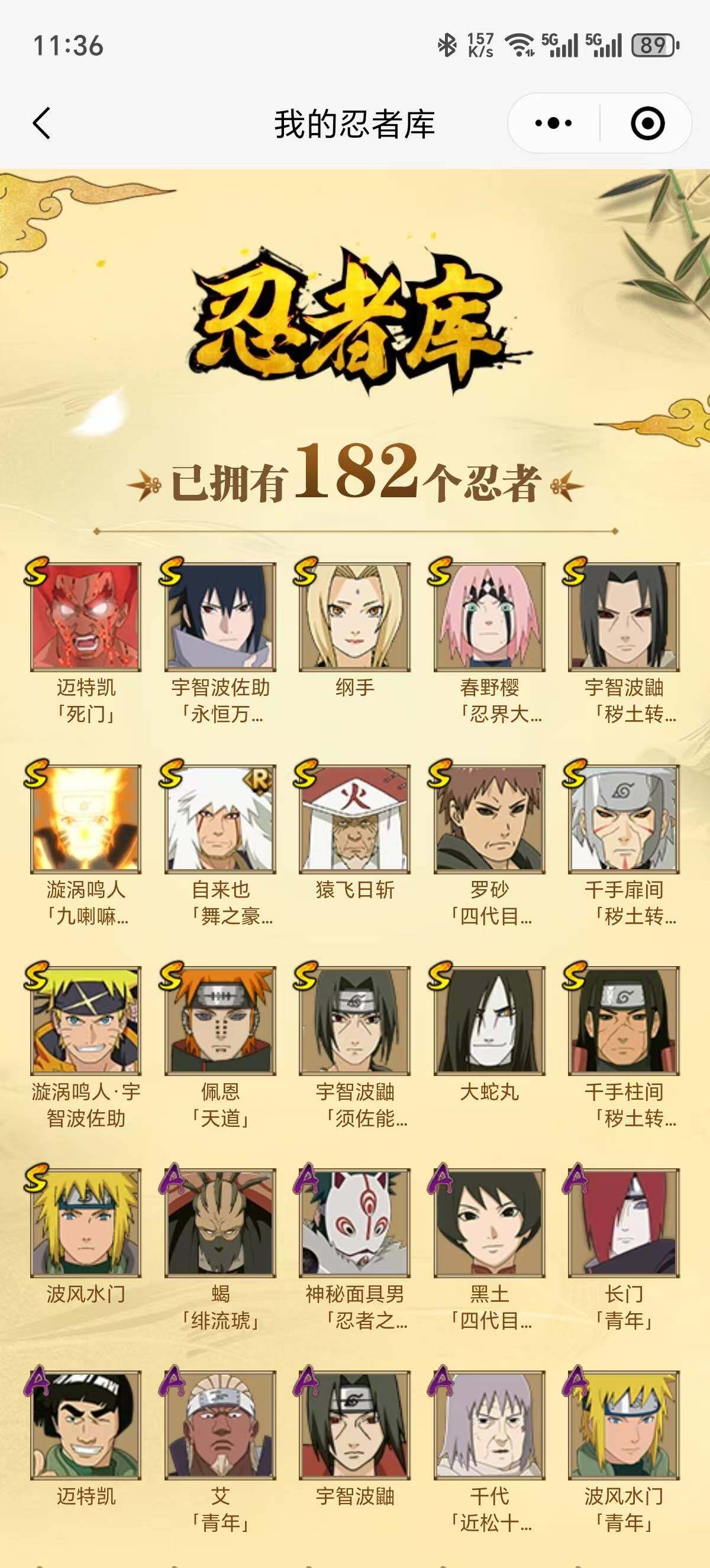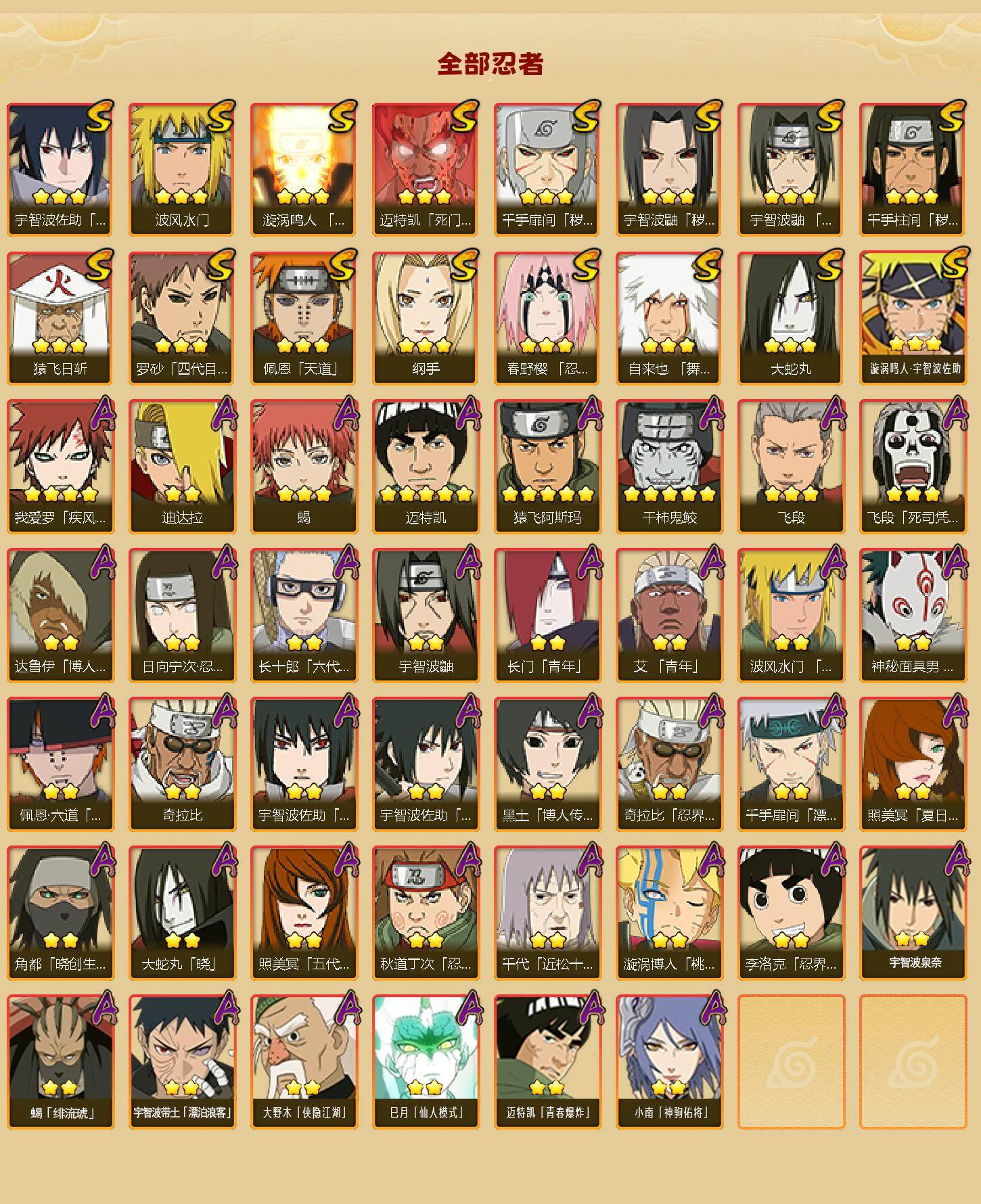 可改实名*16S级忍者数-38A级忍者数【S级忍者】:千手扉间「秽土转生」(3星),千手柱间「秽土转生」(3星),宇智波鼬「秽土转生」(3星),春野樱「忍界大战」(3星),宇智波鼬「须佐能乎」(3星),罗砂「四代目风影」(3星),自来也「舞之豪杰」(3星),大蛇丸(3星),纲手(3星),猿飞日斩(3星),波风水门(3星),漩涡鸣人「九喇嘛连结」(3星),迈特凯「死门」(3星),佩恩「天道」(3星