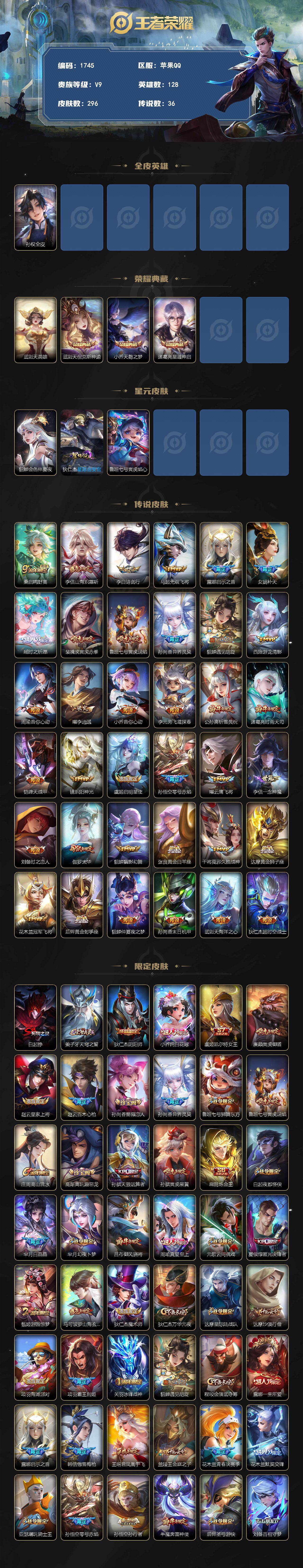 苹果Q-V9-永恒钻石IV段位-128英雄-296皮肤-3典藏皮肤-1典藏英雄-36传说-100史诗