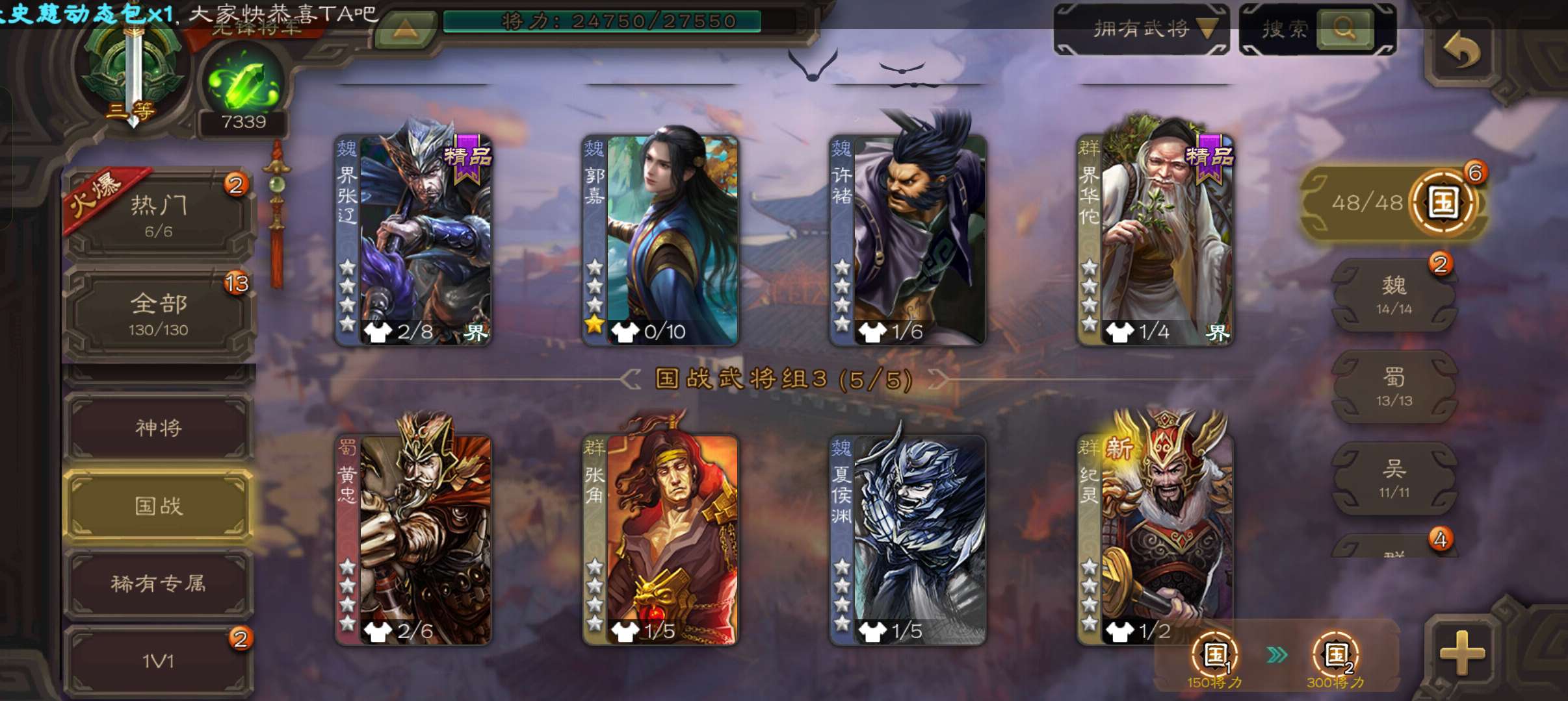 7300将魂5万羽毛,神赵云神刘备双史诗先锋,动态界曹操谋韩当崔琰130将
