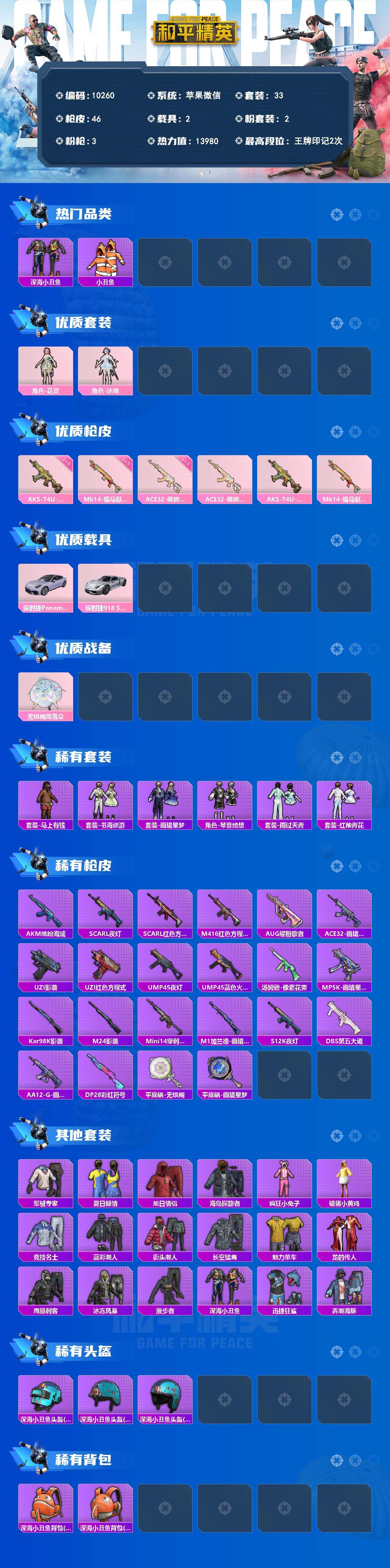 裙子号!妹妹号!苹果 微信-2粉装-3特效枪-2载具-1粉色飞行器-13980热力值-2王牌印记-33套装-46枪皮