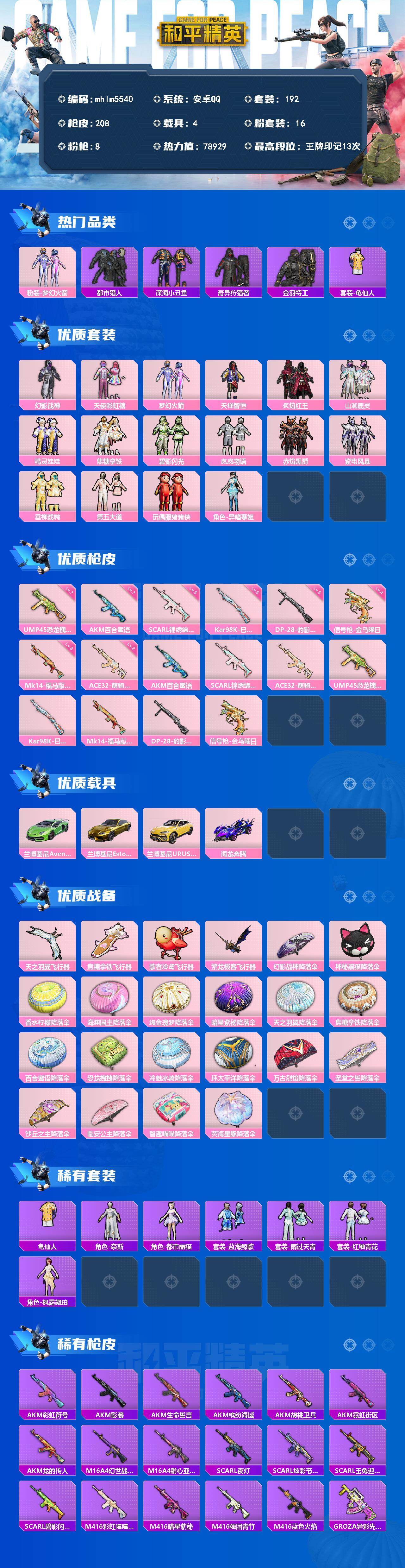 【mhlm5540】安卓 手Q-16粉装-8特效枪-4载具-4粉色飞行器-78929热力值-13王牌印记-192套装-208枪皮