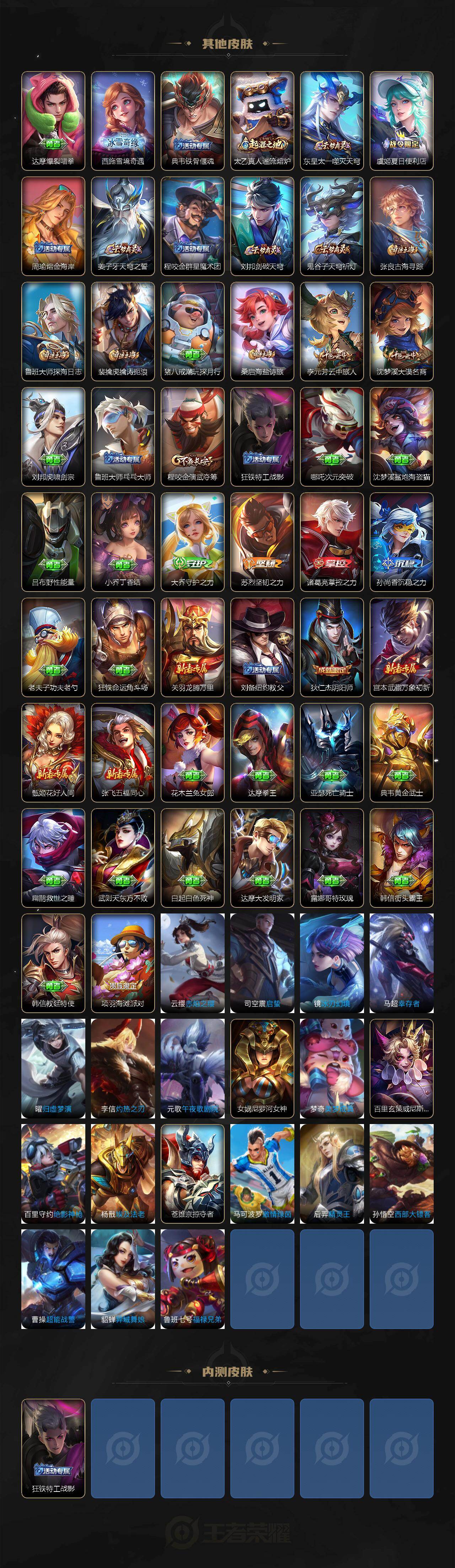 【传说皮肤】:妲己愿照众生和,澜愿照九州拓,裴擒虎祥瑞亨通,露娜霜月吟,镜炽阳神光,达摩黄金狮子座