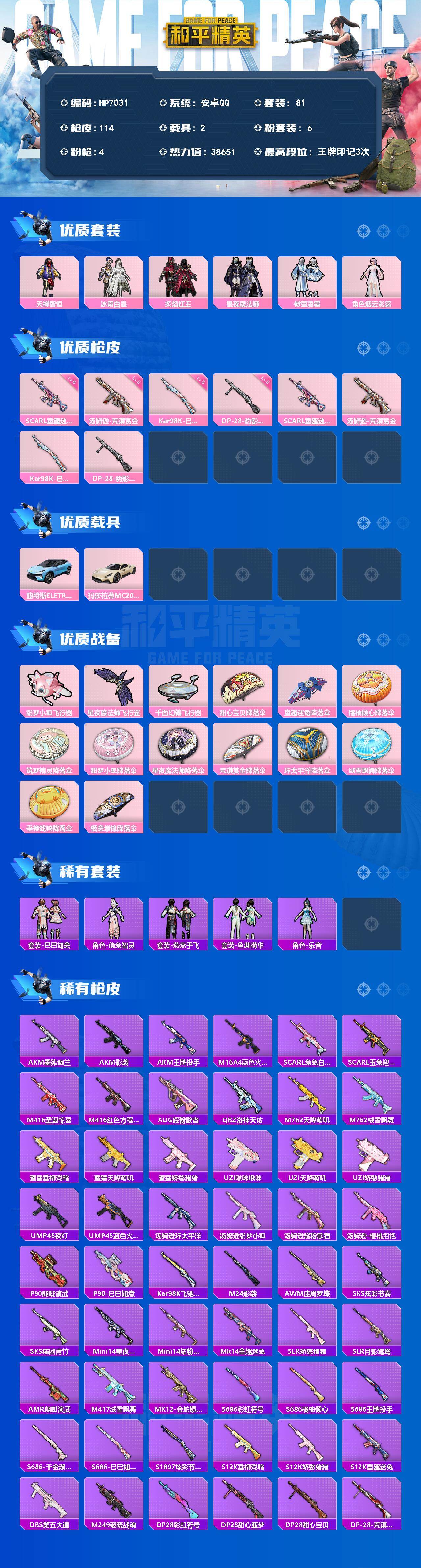 公主号-地铁满天赋-俏兔智灵/乐音/天禅智恒/冰霜白皇/炙焰红王/星夜魔法师/傲雪凌霜/烟云彩露/SCAR童趣迷兔6级/玛莎拉蒂(白)/路特斯(蓝)(6粉装-4粉枪-2载具)没战神框 HP7031-3粉色飞行器-38651热力值-3王牌印记-81套装-114枪皮