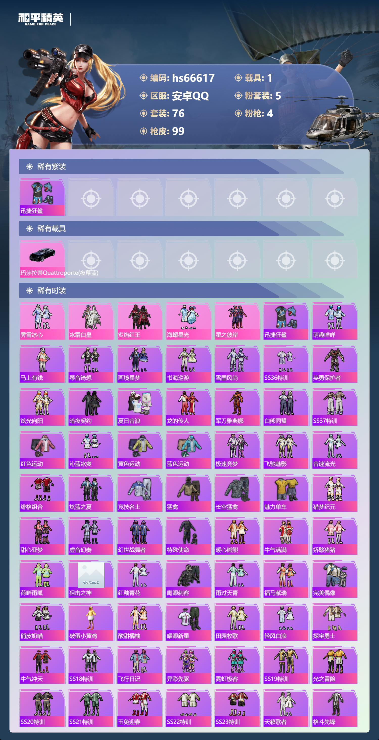 hs66617 安卓手Q-5王牌印记-有战神框-5粉装-4特效枪-1载具-34927热力值-76套装-99枪皮-1卓越印记