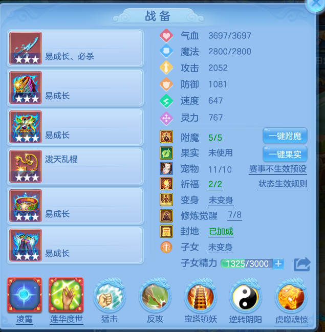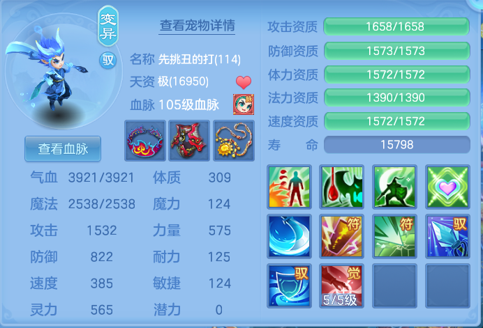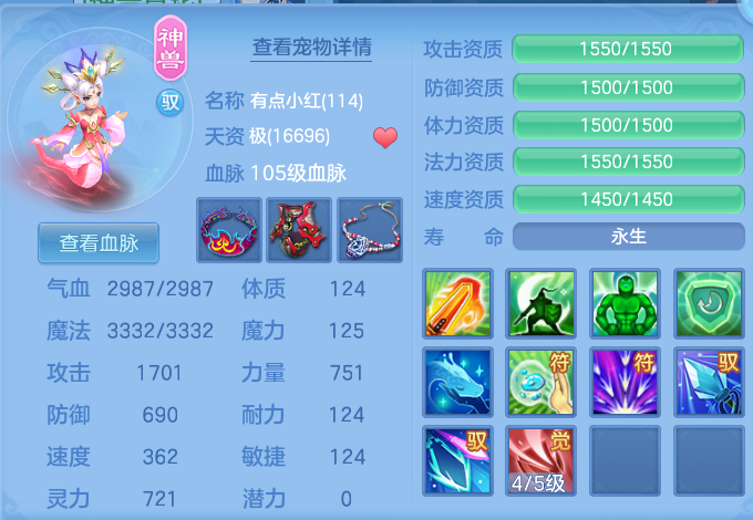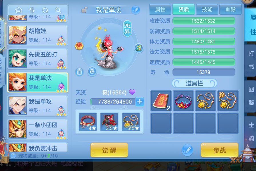 志气冲天 竞技积分2W,银币1300W,铜币5.1亿。坐骑, 3套加点。海景房。两只神兽。仓库物品一大推。截图的宠物都是满技能,除了两只龙虾不是。