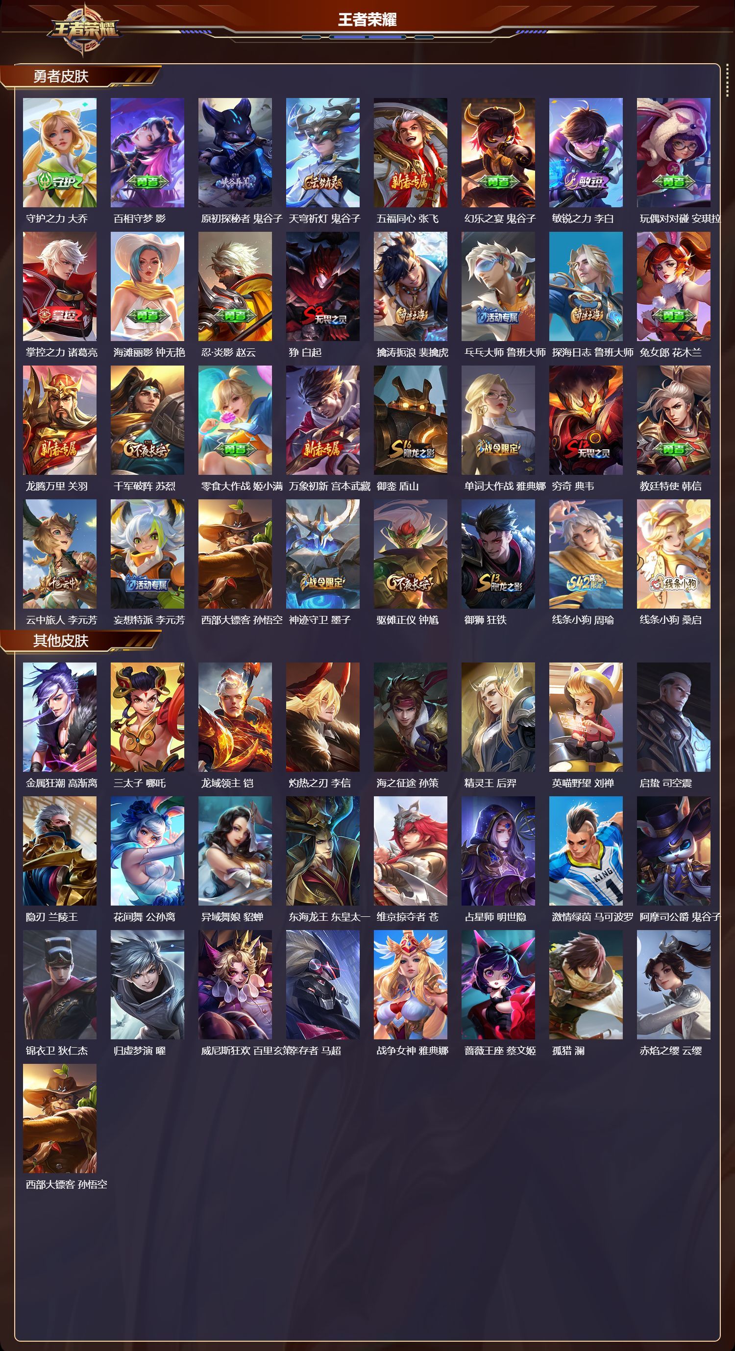 苹果QQ/至圣王者/125皮肤/121英雄/1典藏/0珍品无双/3无双/0珍品传说/13传说/35史