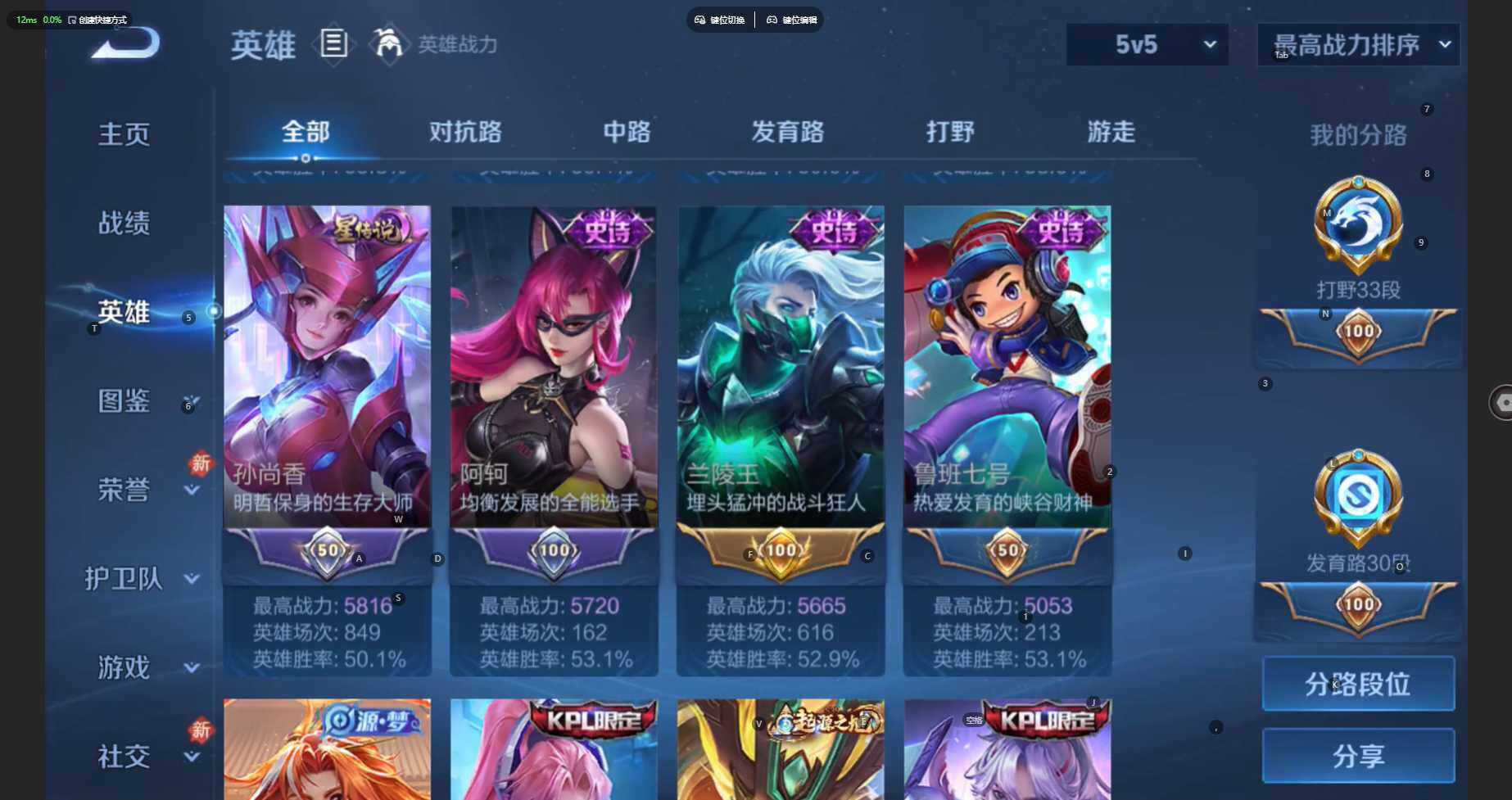 打野33段 中路30段 发育路30段 金标诸葛亮 金标兰陵王 金标孙悟空 金标姜