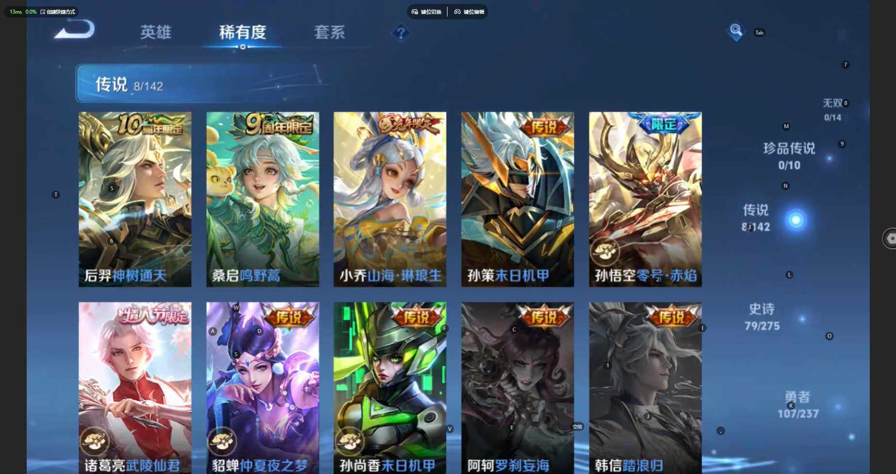 【传说皮肤】:后羿神树通天,桑启鸣野蒿,小乔山海琳琅生,孙策末日机甲,孙悟空零号赤焰,诸葛亮武陵仙君,貂蝉仲夏夜之梦,孙尚香末日机甲