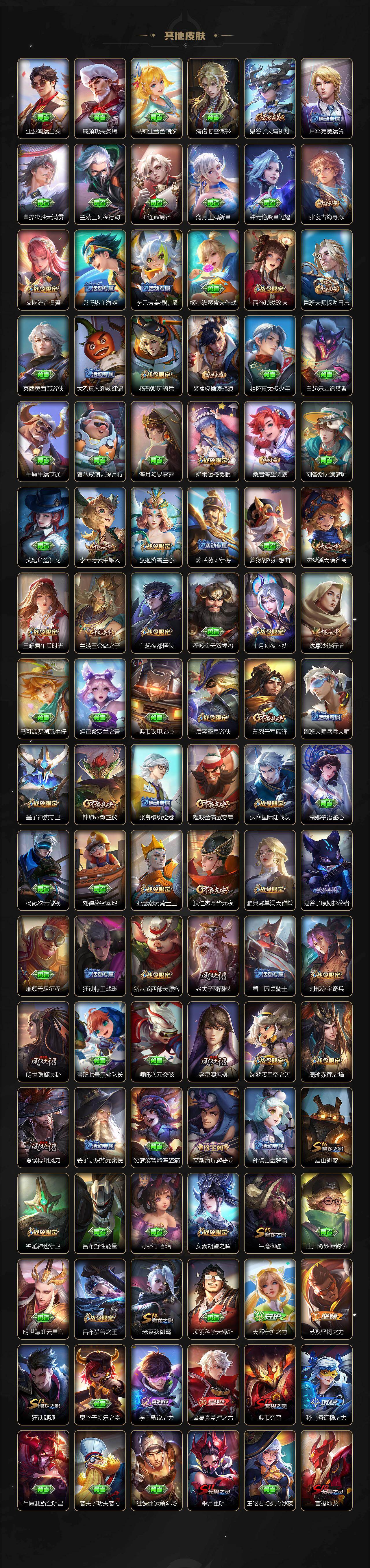 【英雄全皮】:元歌全皮,达摩全皮,孙权全皮,狂铁全皮,李信全皮,猪八戒全皮,敖隐全皮,司空震全皮,戈娅全皮,空空儿全皮