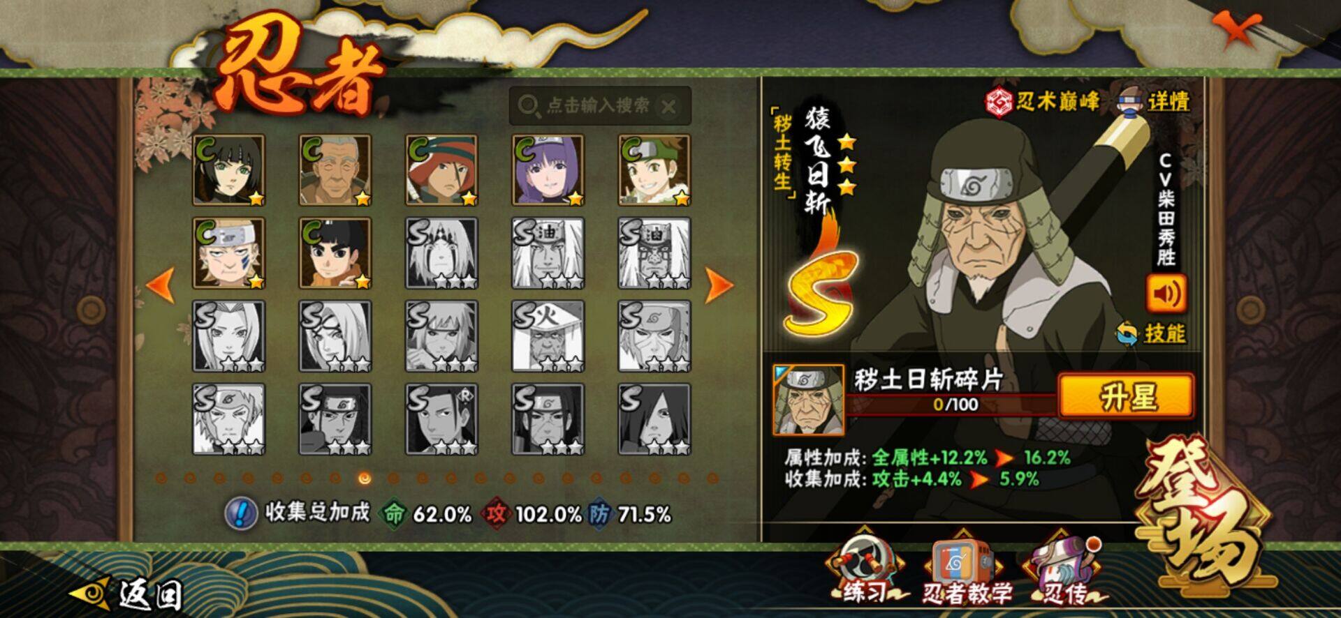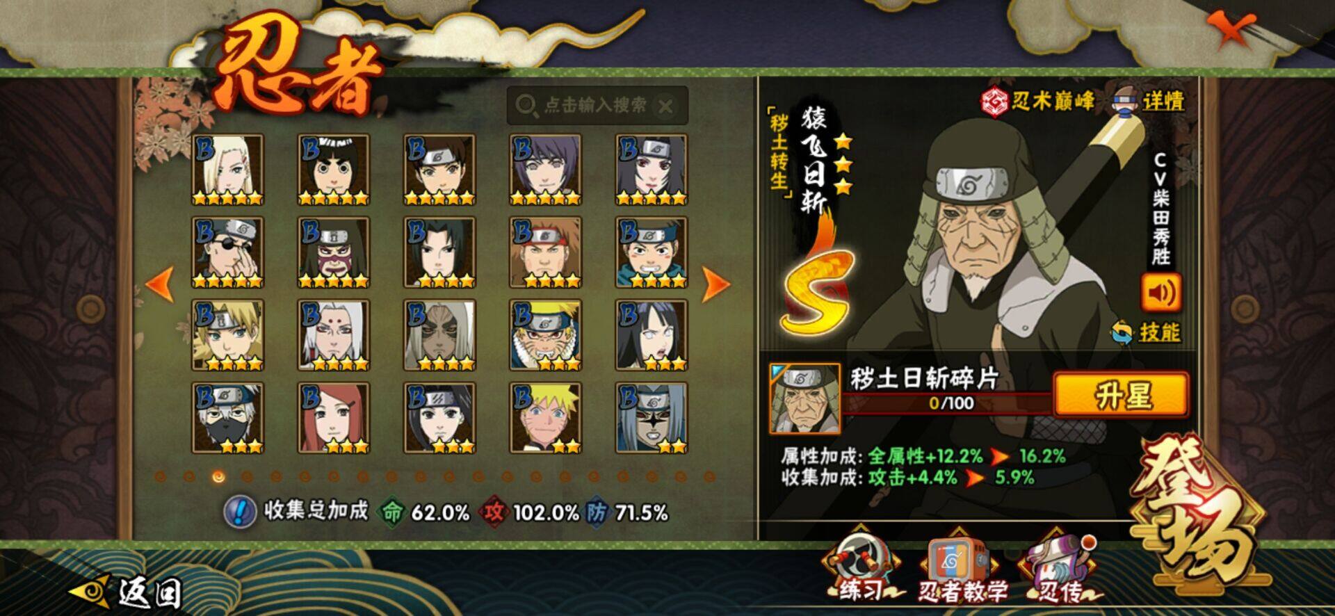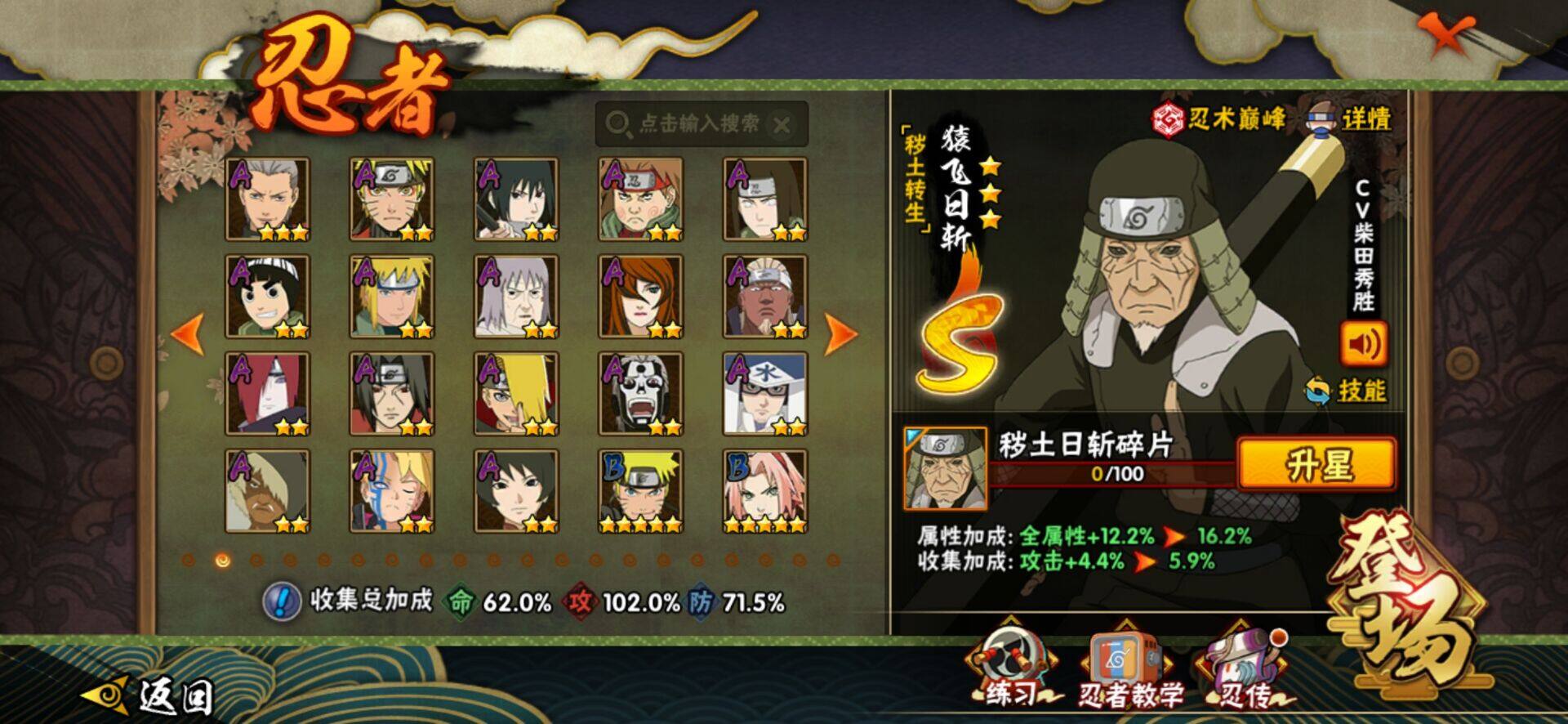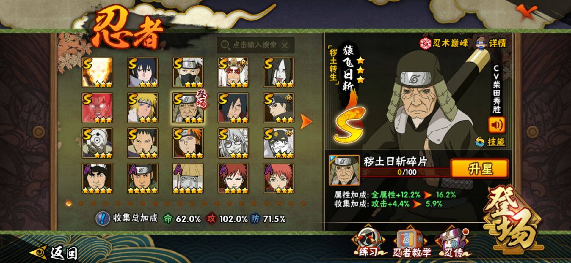 【S级忍者】:猿飞日斩「秽土转生」(3星猿飞日斩「秽土转生」),宇智波斑「秽土转生·解」(3星宇智波斑「秽土转生·解」),宇智波带土「忍界大战」(3星宇智波带土「忍界大战」),宇智波止水「须佐能乎」(3星宇智波止水「须佐能乎」),旗木卡卡西「须佐能乎」(3星旗木卡卡西「须佐能乎」),自来也「舞之豪杰」(3星自来也「舞之豪杰」),大蛇丸(3星大蛇丸),波风水门(3星波风水门),药师兜「仙人模式」(3星药师兜「仙人模式」),漩涡鸣人「