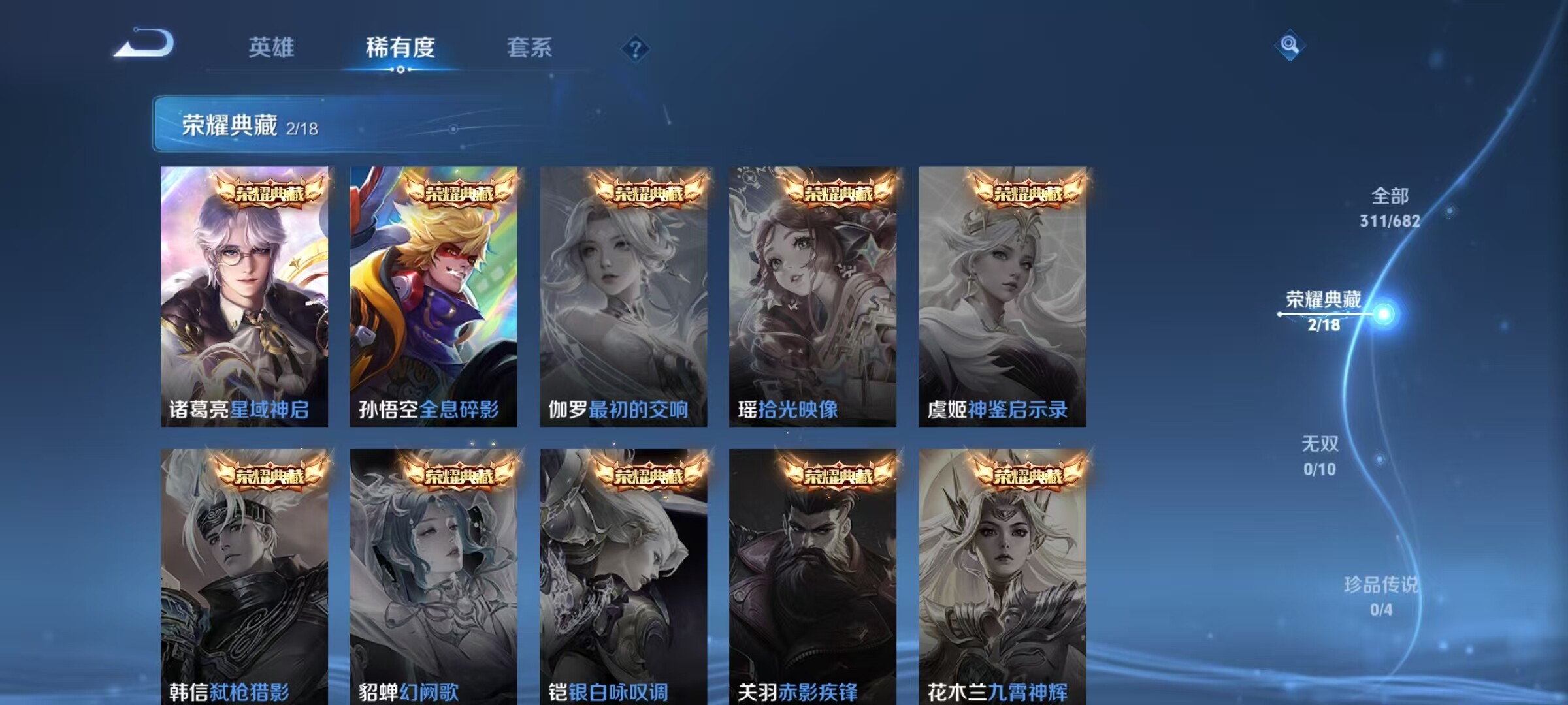 【2典藏 9传说 全息碎影 凤求凰 至尊宝】:安卓Q-V8-至尊星耀II段位-122英雄-311皮肤-2典藏-0无双-0珍品传说-9传说-78史诗
