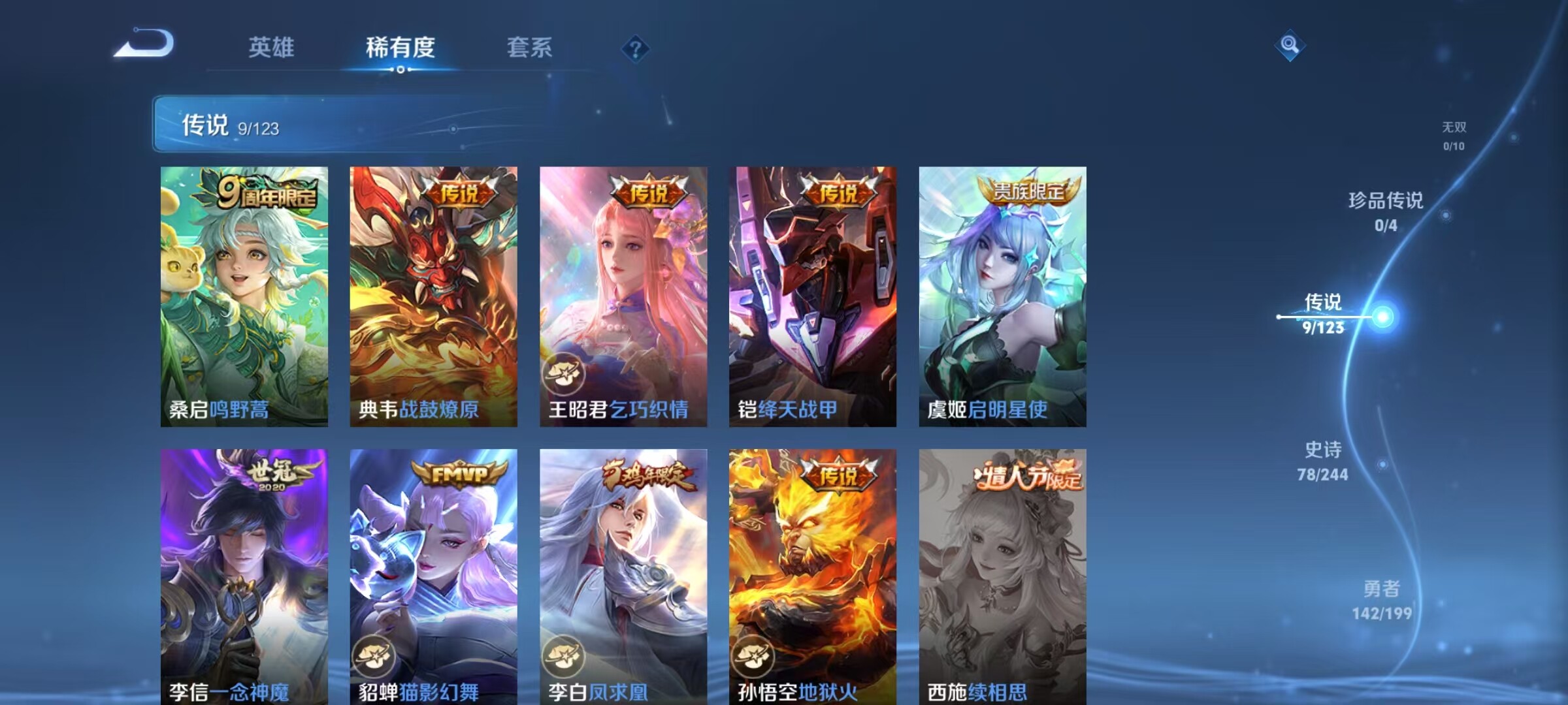 【传说皮肤】:貂蝉猫影幻舞,孙悟空地狱火,虞姬启明星使,铠绛天战甲,李信一念神魔,王昭君乞巧织情,典韦战鼓燎原,桑启鸣野蒿