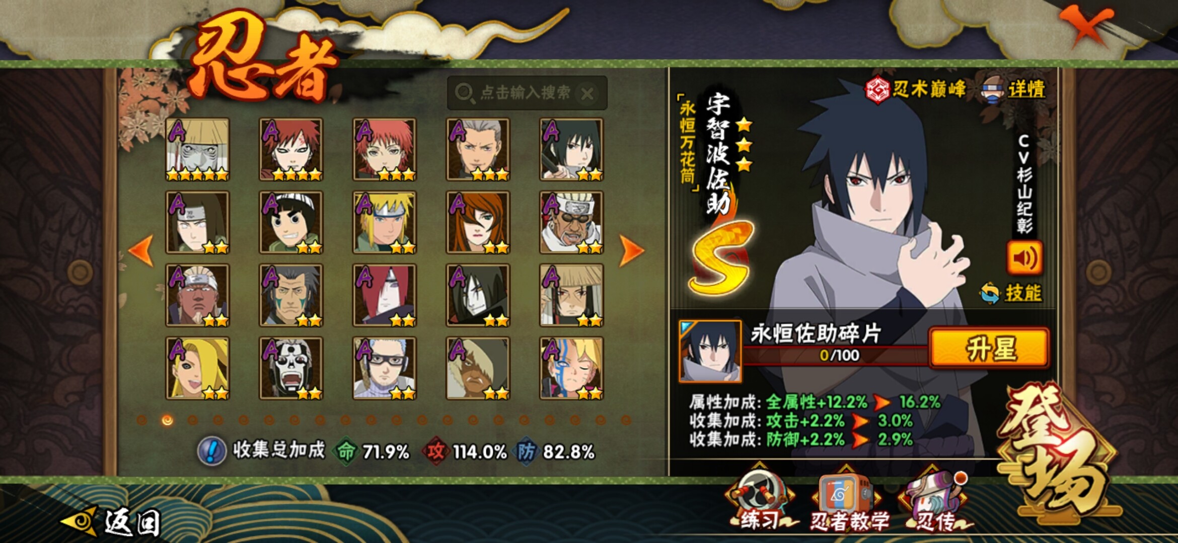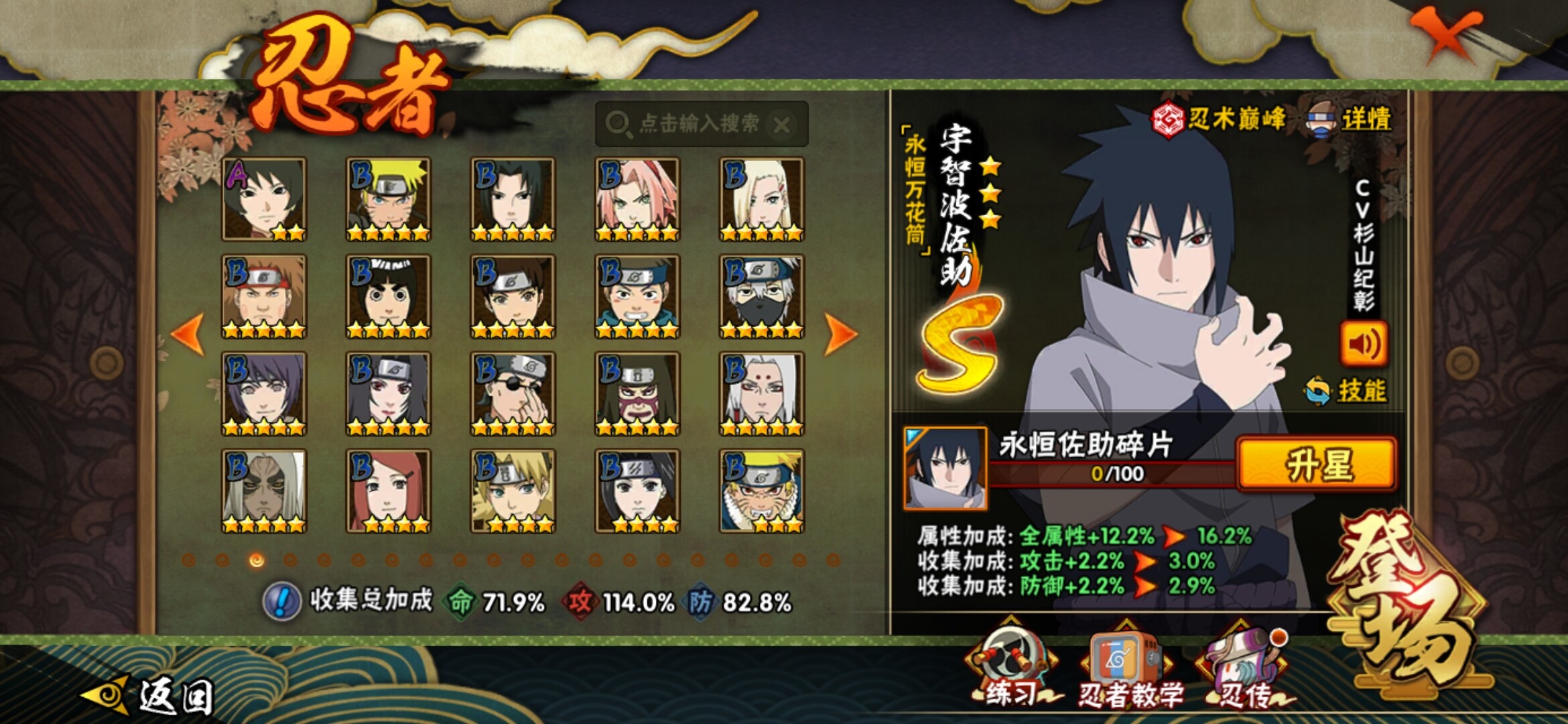 【S级忍者】:千手柱间「秽土转生」(3星千手柱间「秽土转生」),宇智波鼬「秽土转生」(3星宇智波鼬「秽土转生」),宇智波斑「秽土转生」(3星宇智波斑「秽土转生」),宇智波斑「秽土转生·解」(3星宇智波斑「秽土转生·解」),艾「忍界大战」(3星艾「忍界大战」),自来也(3星自来也),自来也「舞之豪杰」(3星自来也「舞之豪杰」),大蛇丸(3星大蛇丸),纲手(3星纲手),猿飞日斩(3星猿飞日斩),波风水门(3星波风水门),药师兜「仙