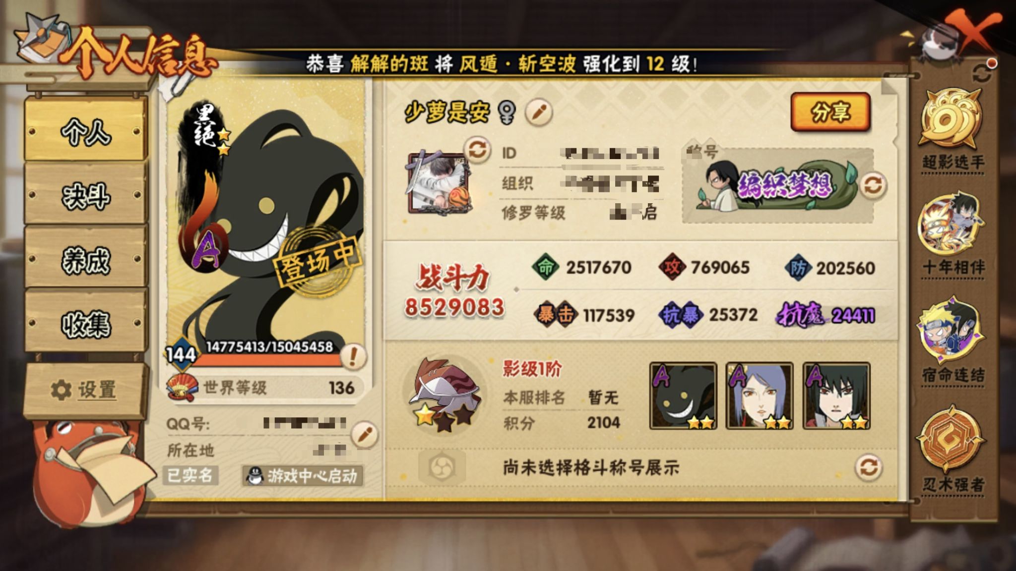 852w战力五影斑创柱20s+黑绝3直购35a战力852账号