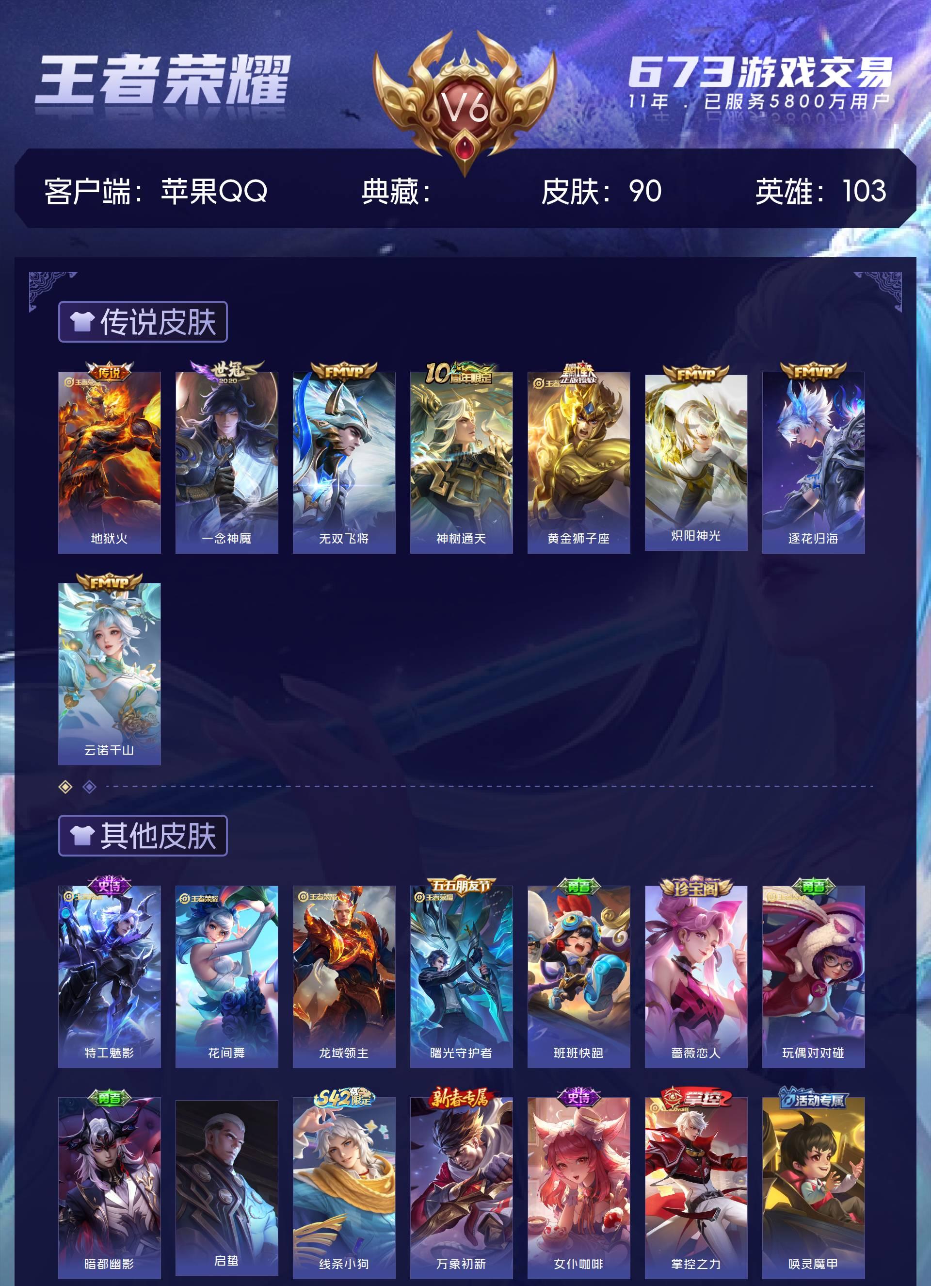 V6 皮肤90 英雄103 至尊星耀 传说8