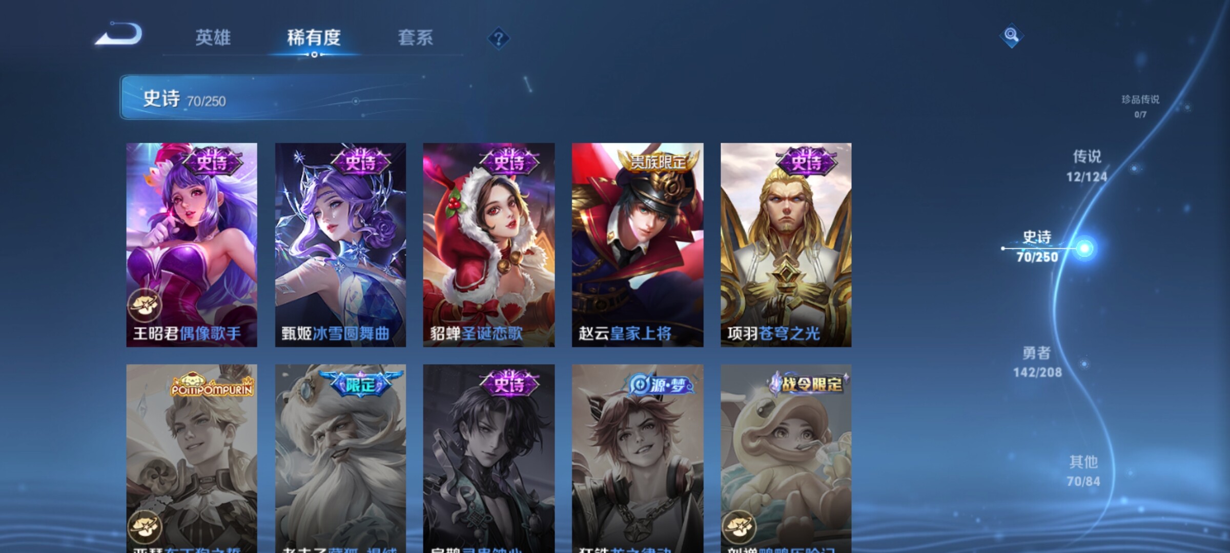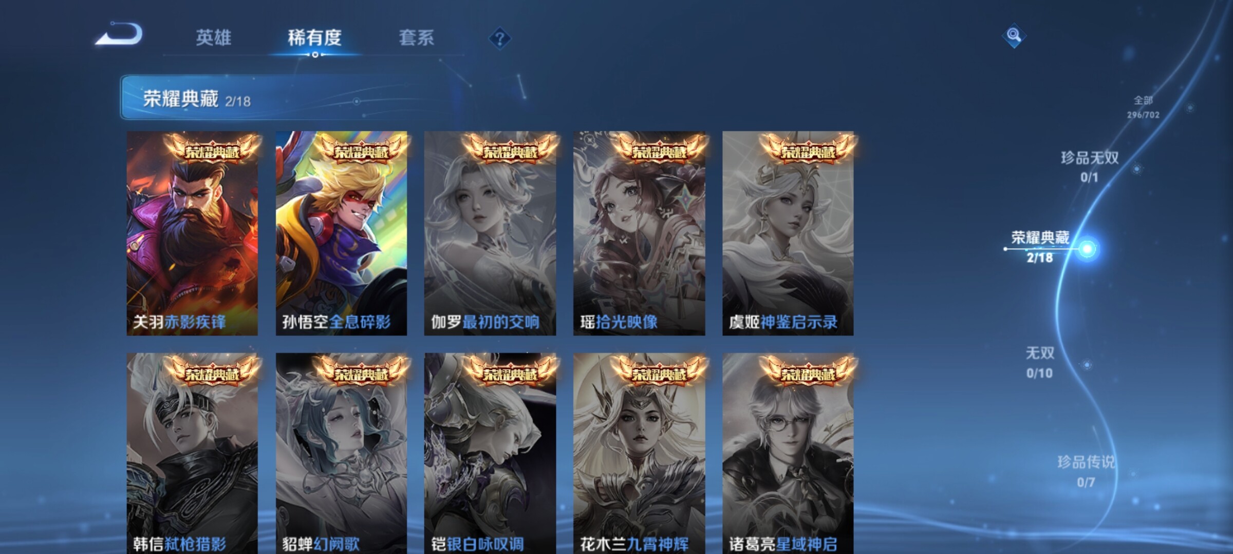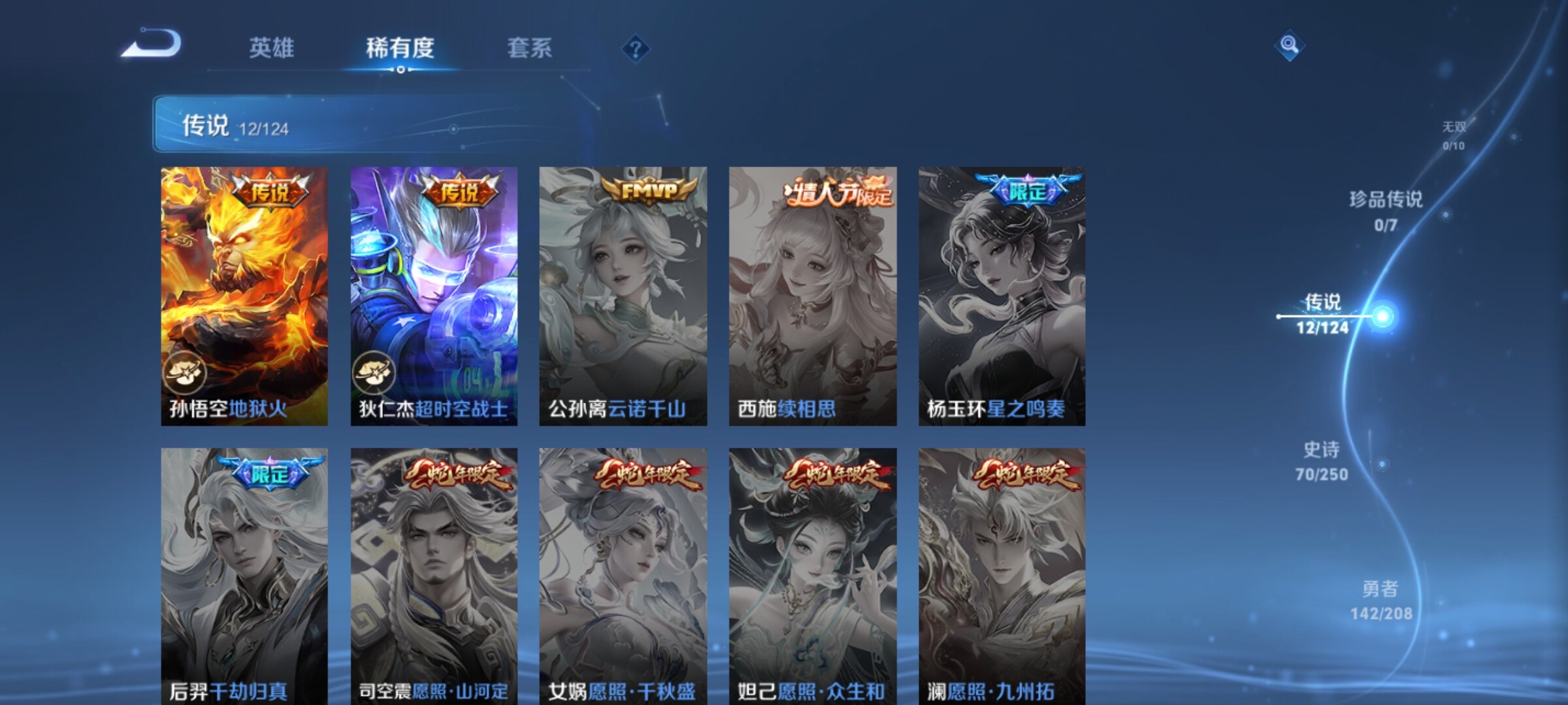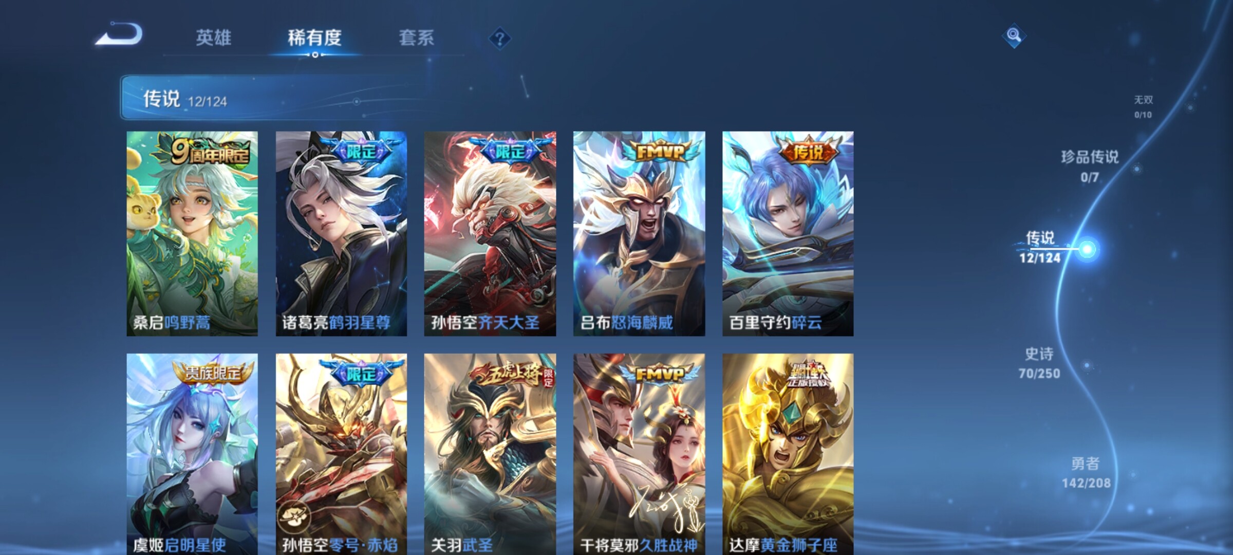 【传说皮肤】:桑启鸣野蒿,诸葛亮鹤羽星尊,孙悟空齐天大圣,吕布怒海麟威,百里守约碎云,虞姬启明星使,孙悟空零号赤焰,关羽武圣,干将莫邪久胜战神,达摩黄金狮子座,孙悟空地狱火,狄仁杰