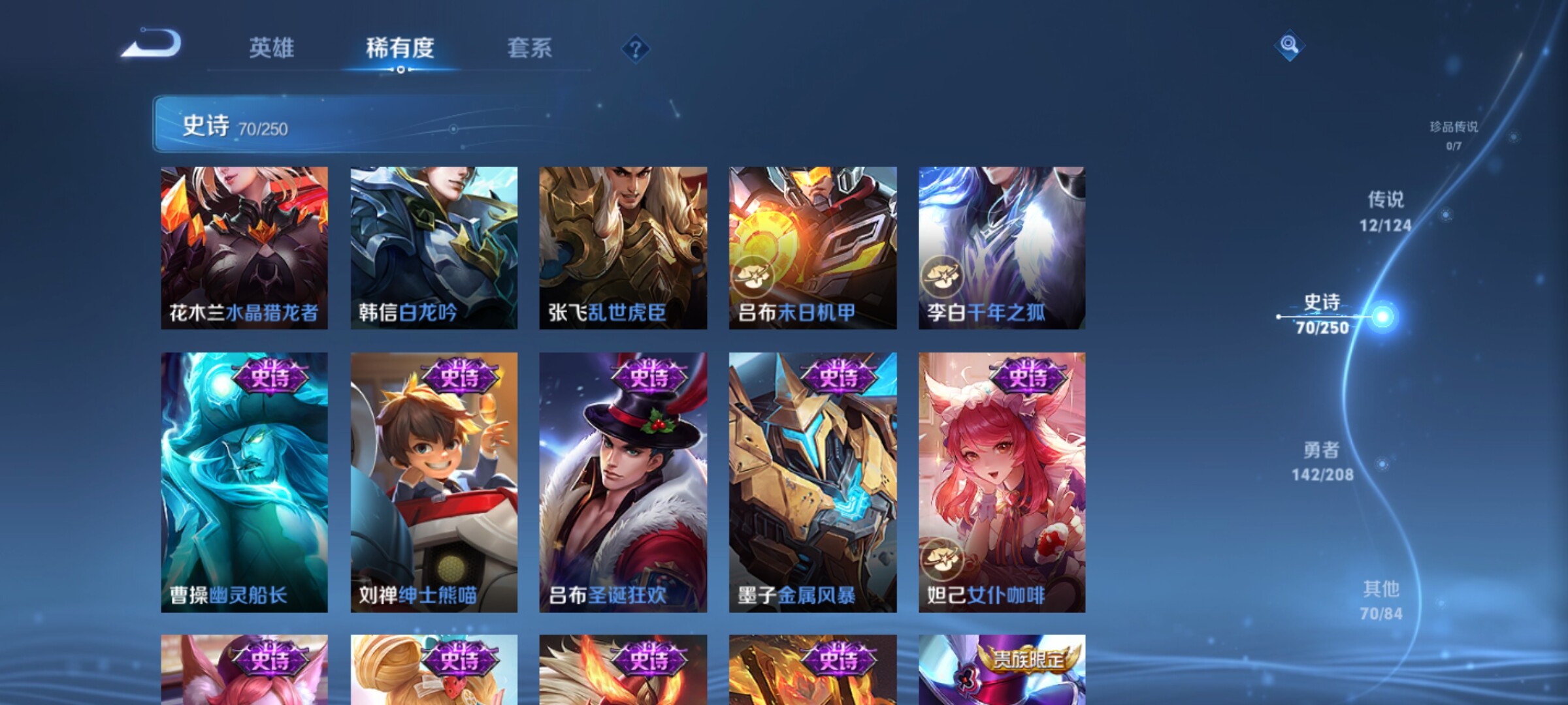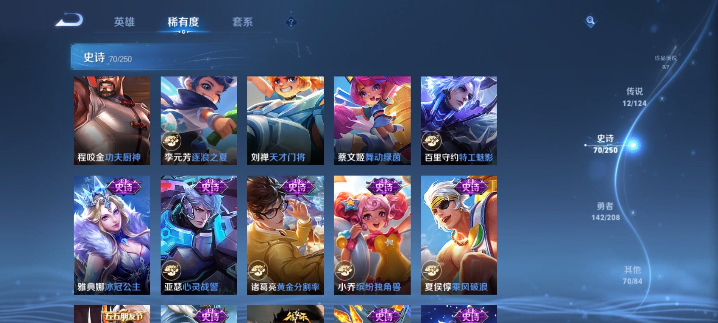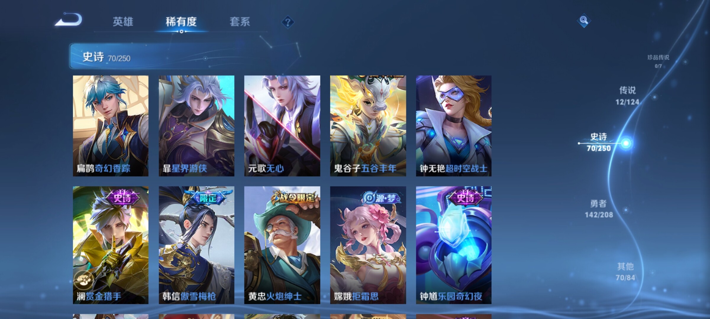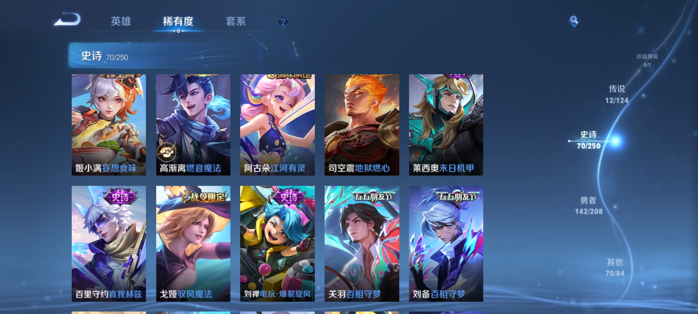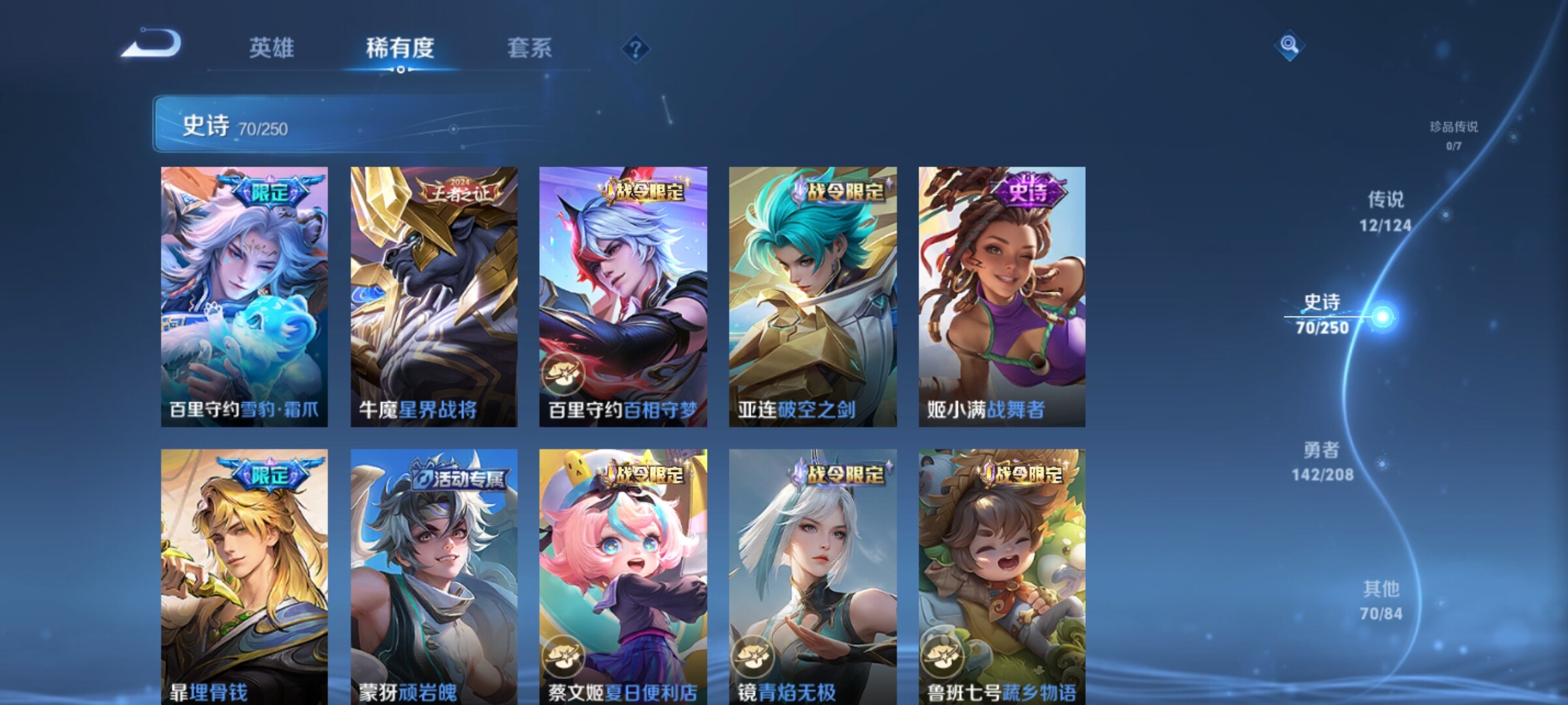 【传说皮肤】:桑启鸣野蒿,诸葛亮鹤羽星尊,孙悟空齐天大圣,吕布怒海麟威,百里守约碎云,虞姬启明星使,孙悟空零号赤焰,关羽武圣,干将莫邪久胜战神,达摩黄金狮子座,孙悟空地狱火,狄仁杰
