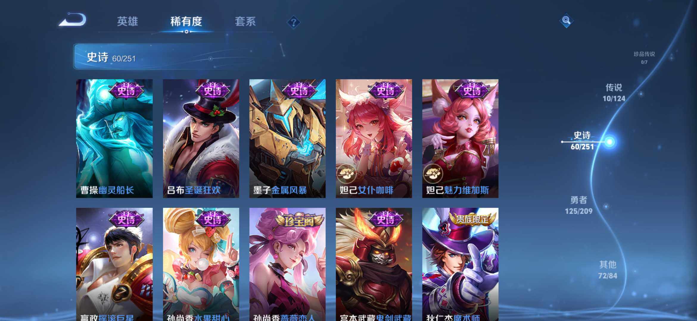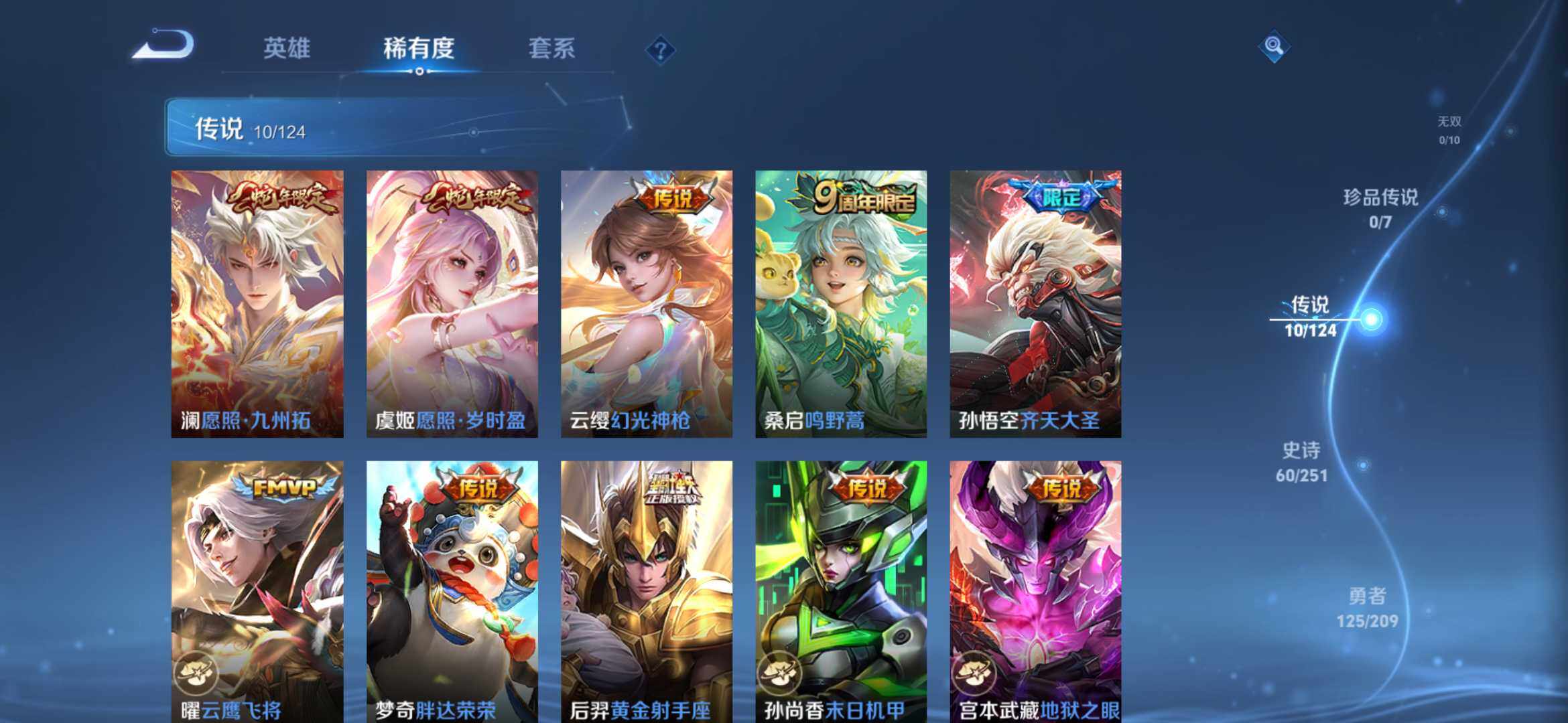 【传说皮肤】:宫本武藏地狱之眼,孙尚香末日机甲,后羿黄金射手座,梦奇胖达荣荣,曜云鹰飞将,孙悟空齐天大圣,桑启鸣野蒿,云缨幻光神枪,虞姬愿照岁时盈,澜愿照九州拓