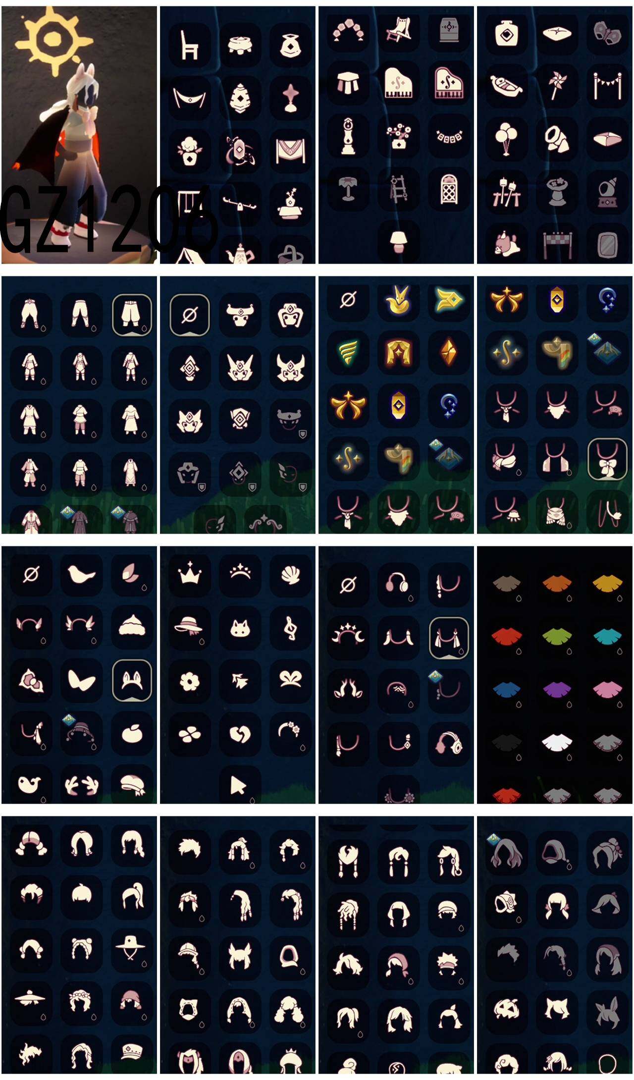 【毕业图】晨岛,云野,雨林,霞谷,暮土,禁阁 【毕业季】潜海季,表演季,破晓季,欧若拉,追忆季,二重奏季,彩染季 【蜡烛】20 【爱心】104 【稀有礼包】披肩外袍,圣诞雪人,星月头冠,神鹿祝福礼包,彩虹耳饰,彩虹耳机,大蝴蝶结,水母肩饰,贝壳发饰,玉兔发饰,四叶草头饰,创始人斗篷,鲤跃龙门,海龟斗篷,蝙蝠斗,蛛网斗篷,白雪斗篷,绊爱礼包,