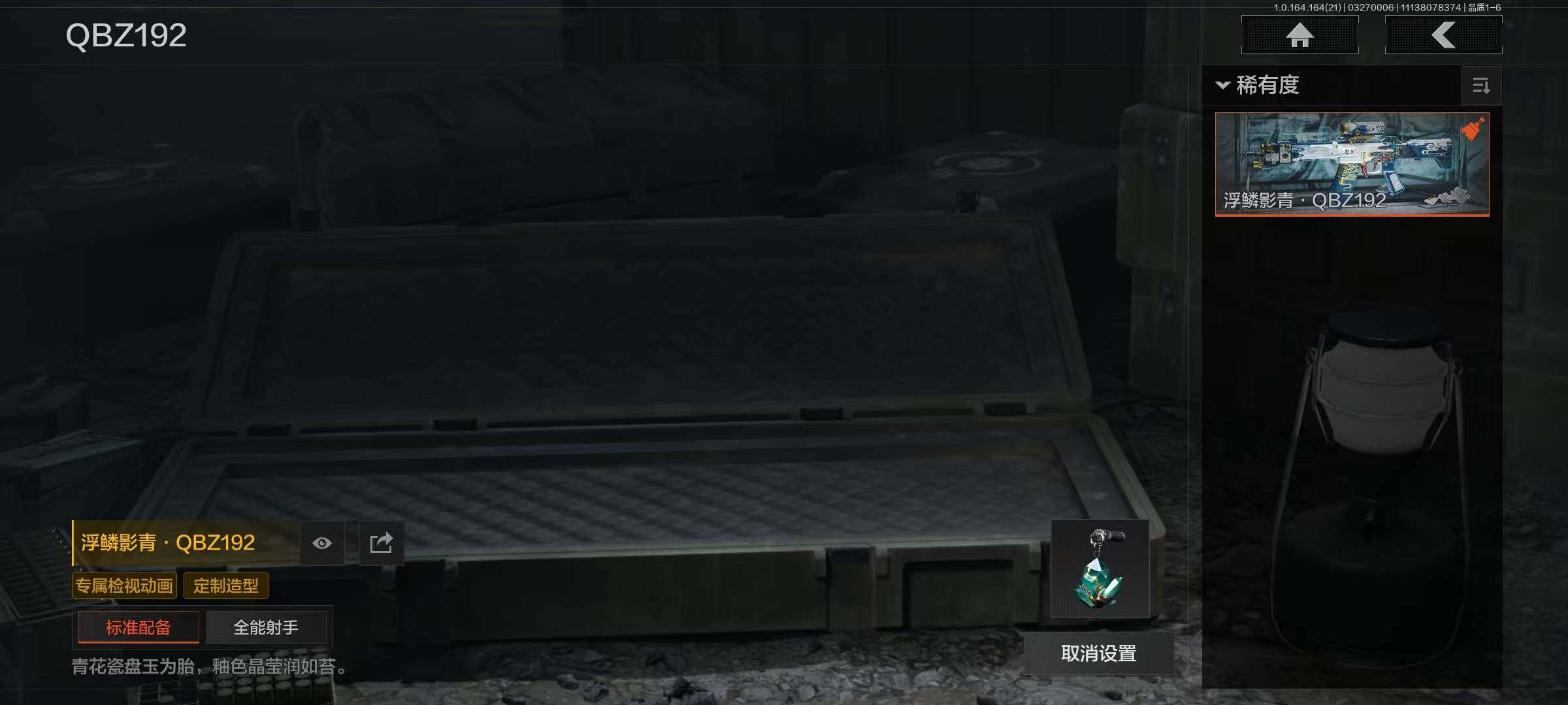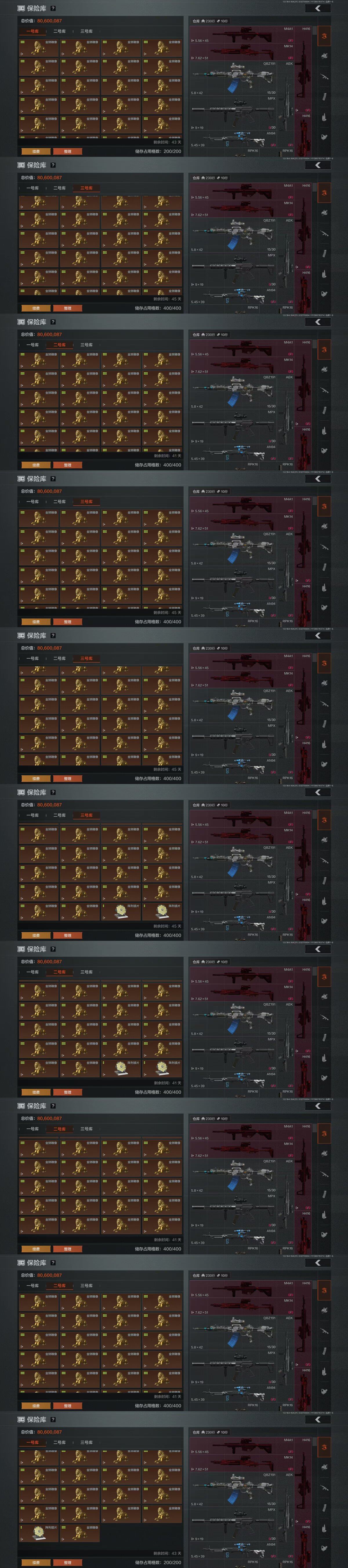 【金色枪皮】:骑士之剑AX50,旧王圣谕VSS,浮鳞影青QBZ192,旧王圣谕QBZ191,镀火熔金H416,地脉深处FAL