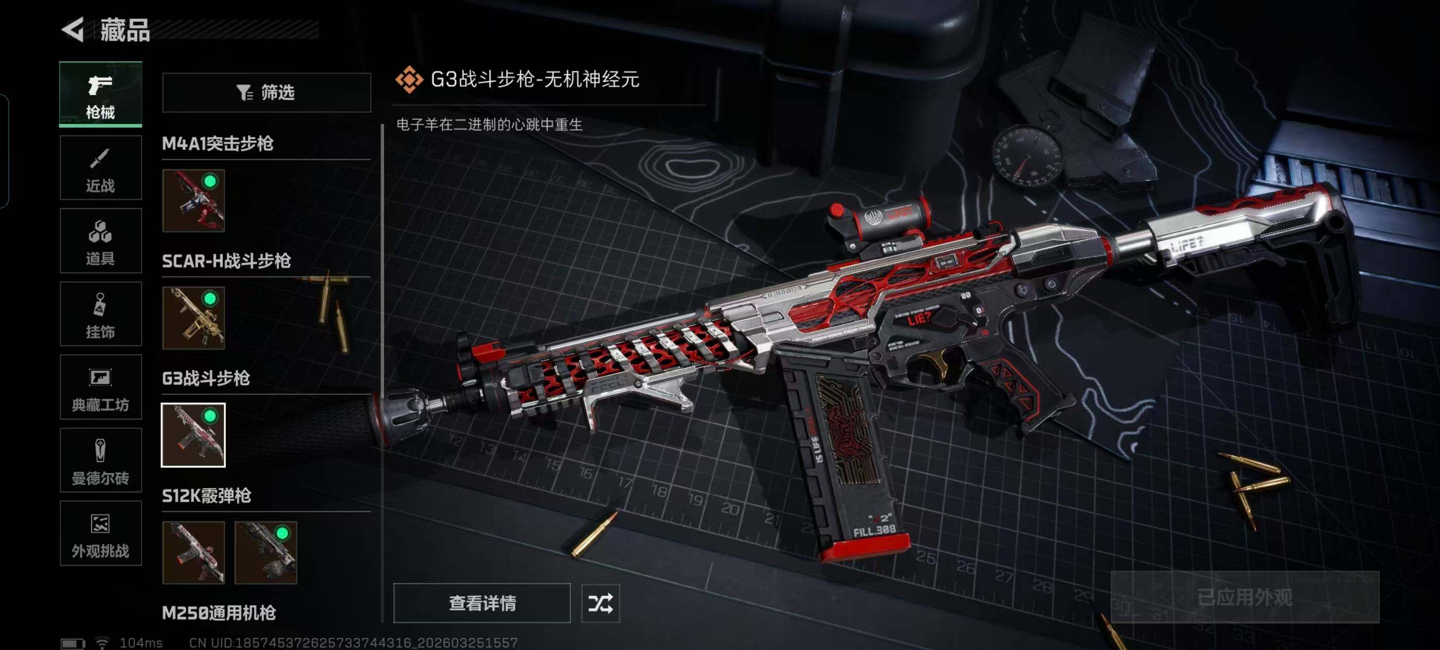 【传说外观】:M4A1突击步枪-阿米娅,SCAR-H战斗步枪-启航,G3战斗步枪-无机神经元,S12K霰弹枪-电锯惊魂,S12K霰弹枪-无机神经元,M250通用机枪-骑士之心,M14射手步枪-电锯惊魂,R93狙击步枪-
