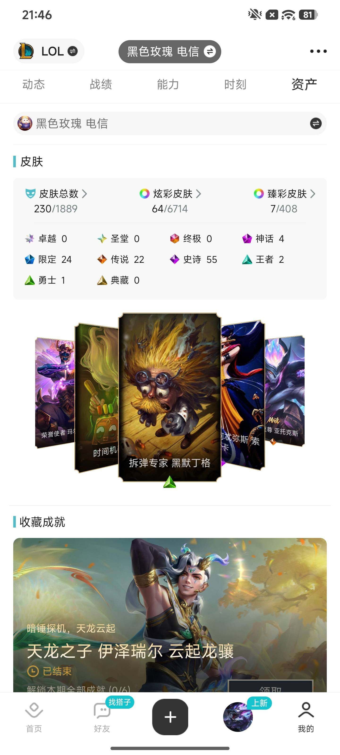 【店主推荐捡漏号!可直接换绑】未定级段位-172英雄-230皮肤-64炫彩-0终极-4神话-24限定-22传说-55史诗