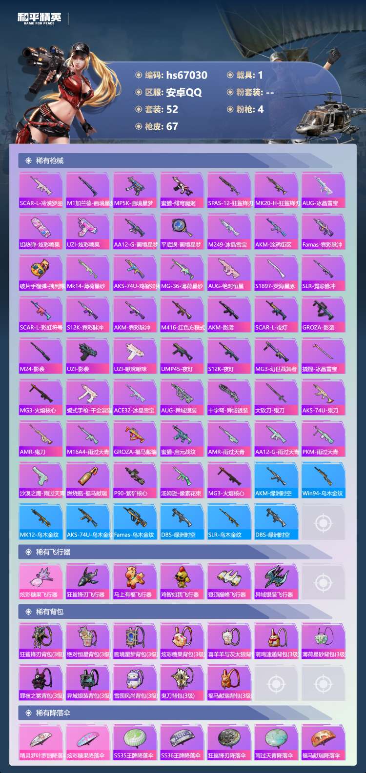 hs67030 苹果手Q-5王牌印记-4特效枪-1载具-18581热力值-52套装-67枪皮-1卓越