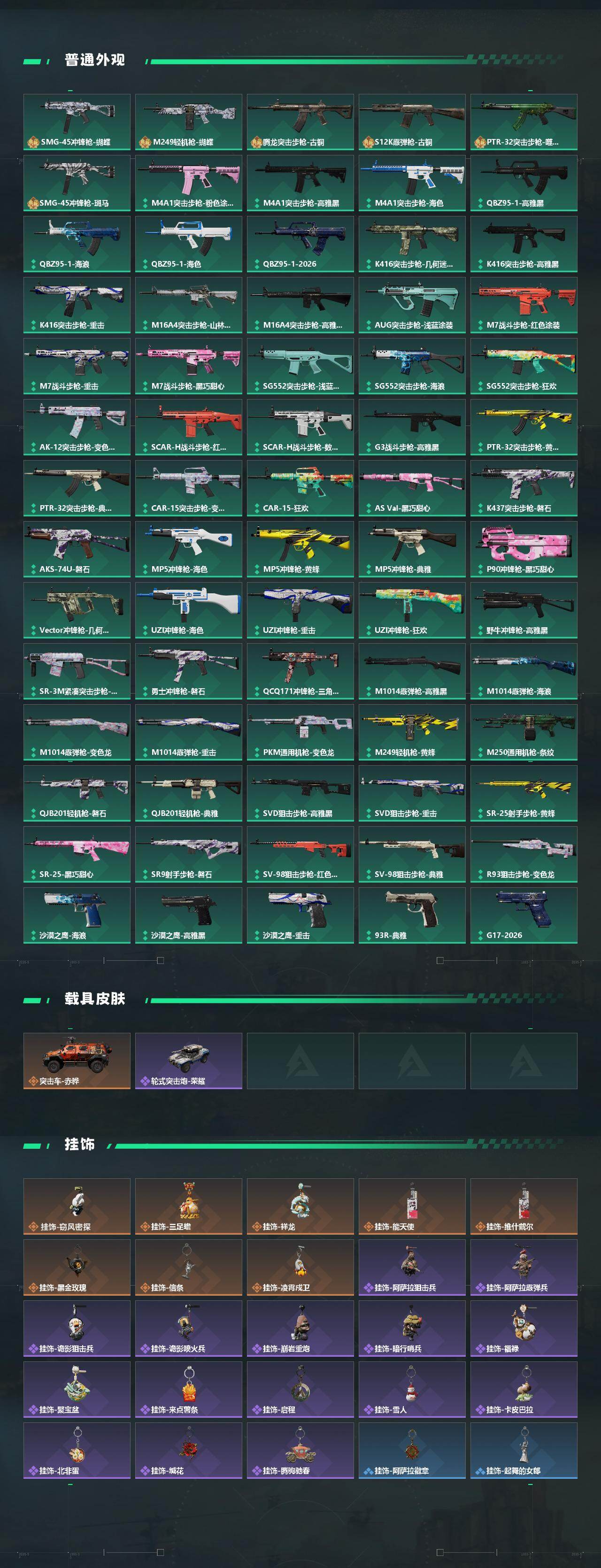 【传说外观】:M4A1突击步枪-蚀金玫瑰,QBZ95-1突击步枪-凌霄戍卫,QBZ95-1突击步枪-腾驹驰春,SG552突击步枪-运动员,SCAR-H战斗步枪-水墨云图,SCAR-H战斗步枪-启航,腾龙突击步枪-捞点薯条,KC17突击步枪-电锯惊魂