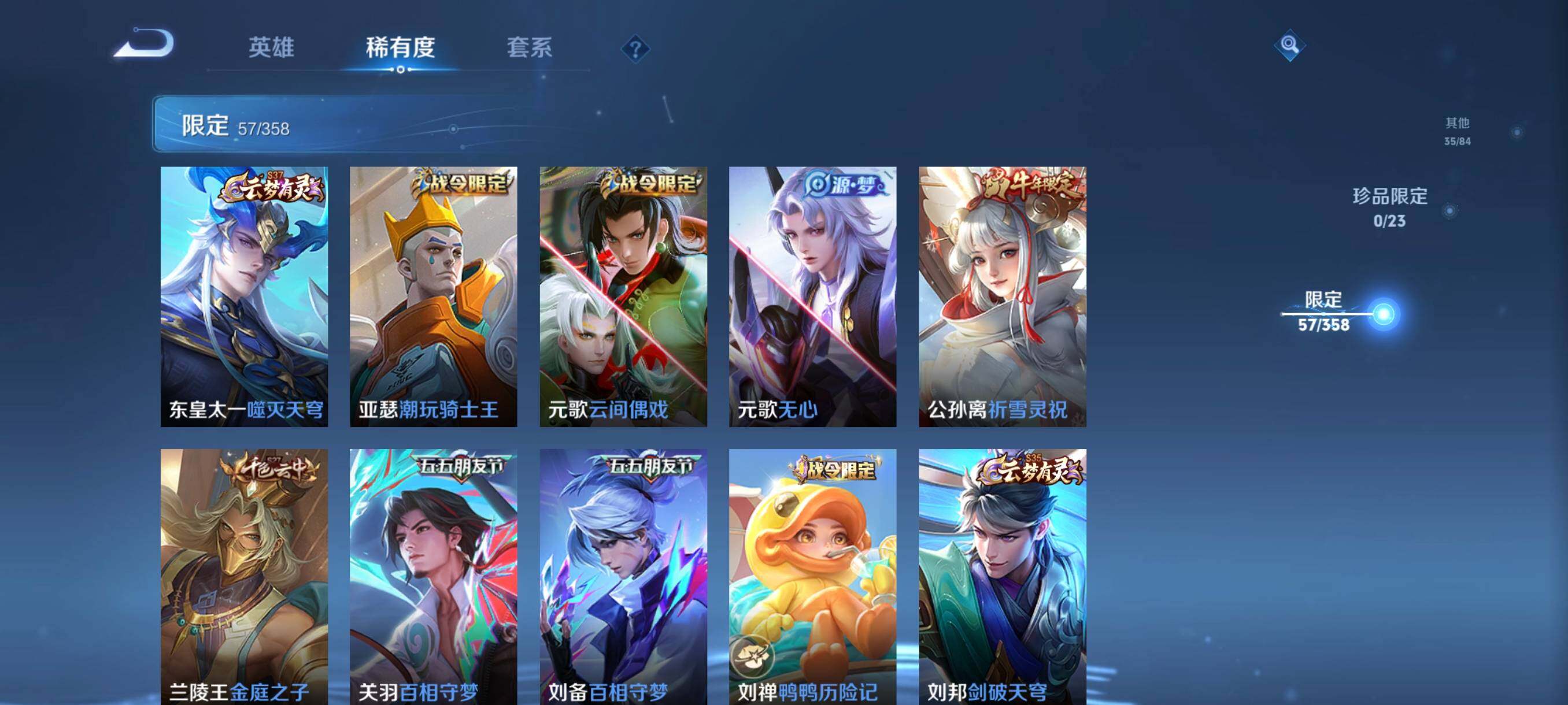 【传说皮肤】:桑启鸣野蒿,澜逐花归海,诸葛亮鹤羽星尊,张飞百相守梦,干将莫邪画中仙,李白诗剑行,百里守约碎云,马可波罗深海之息,公孙离祈雪灵祝,诸葛亮时雨天司,铠绛天战甲,孙悟空零号赤焰,后