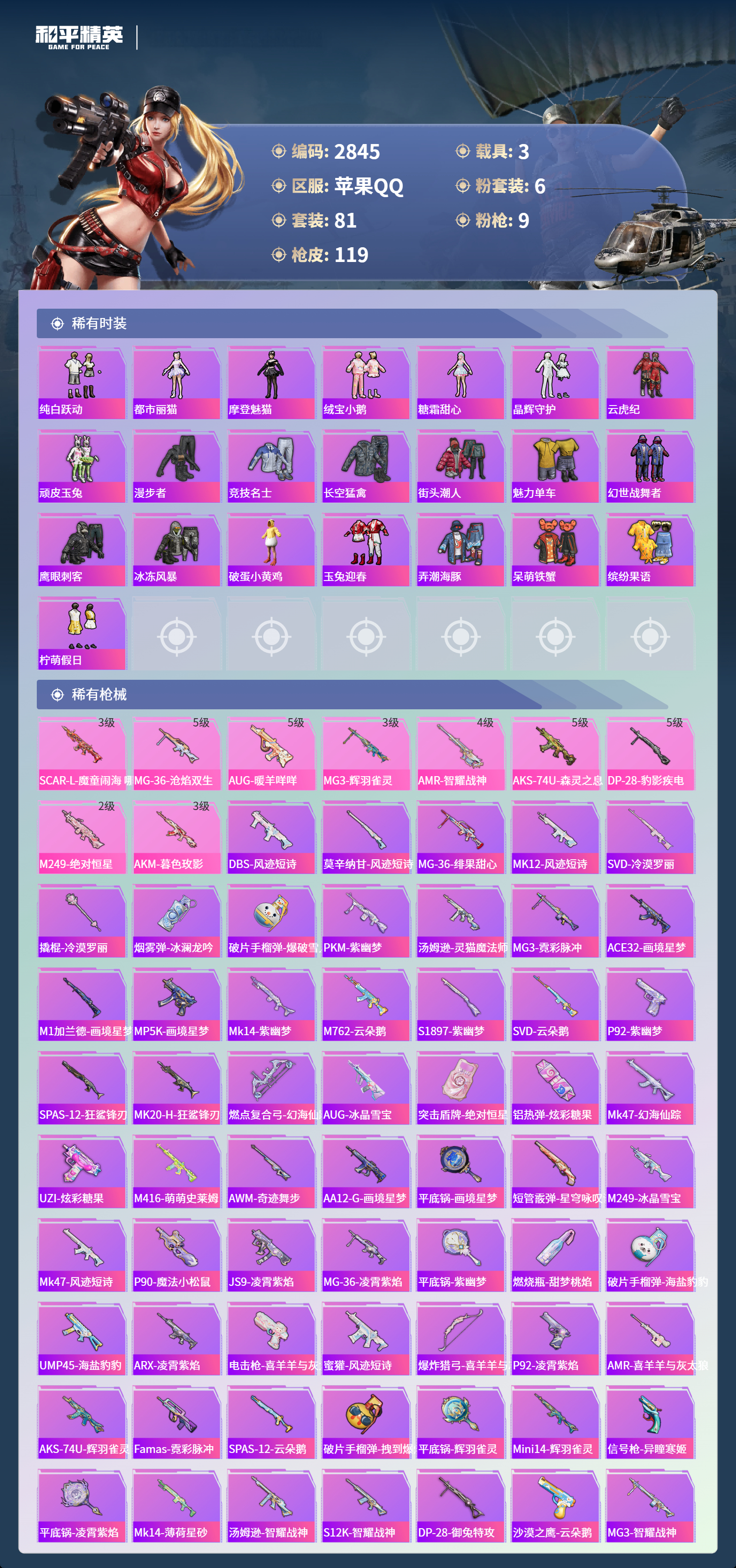 1绝世-1红装-6粉装-9特效枪-3载具-